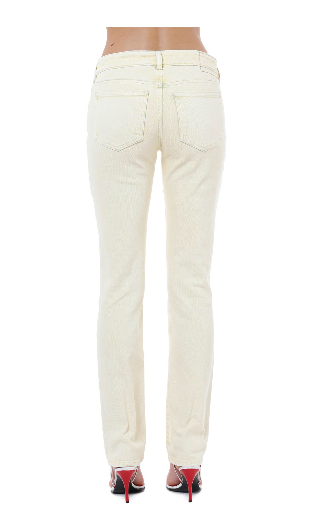 Slim style jean with low waist and straight leg with a zip fly, finished in a light yellow wash.