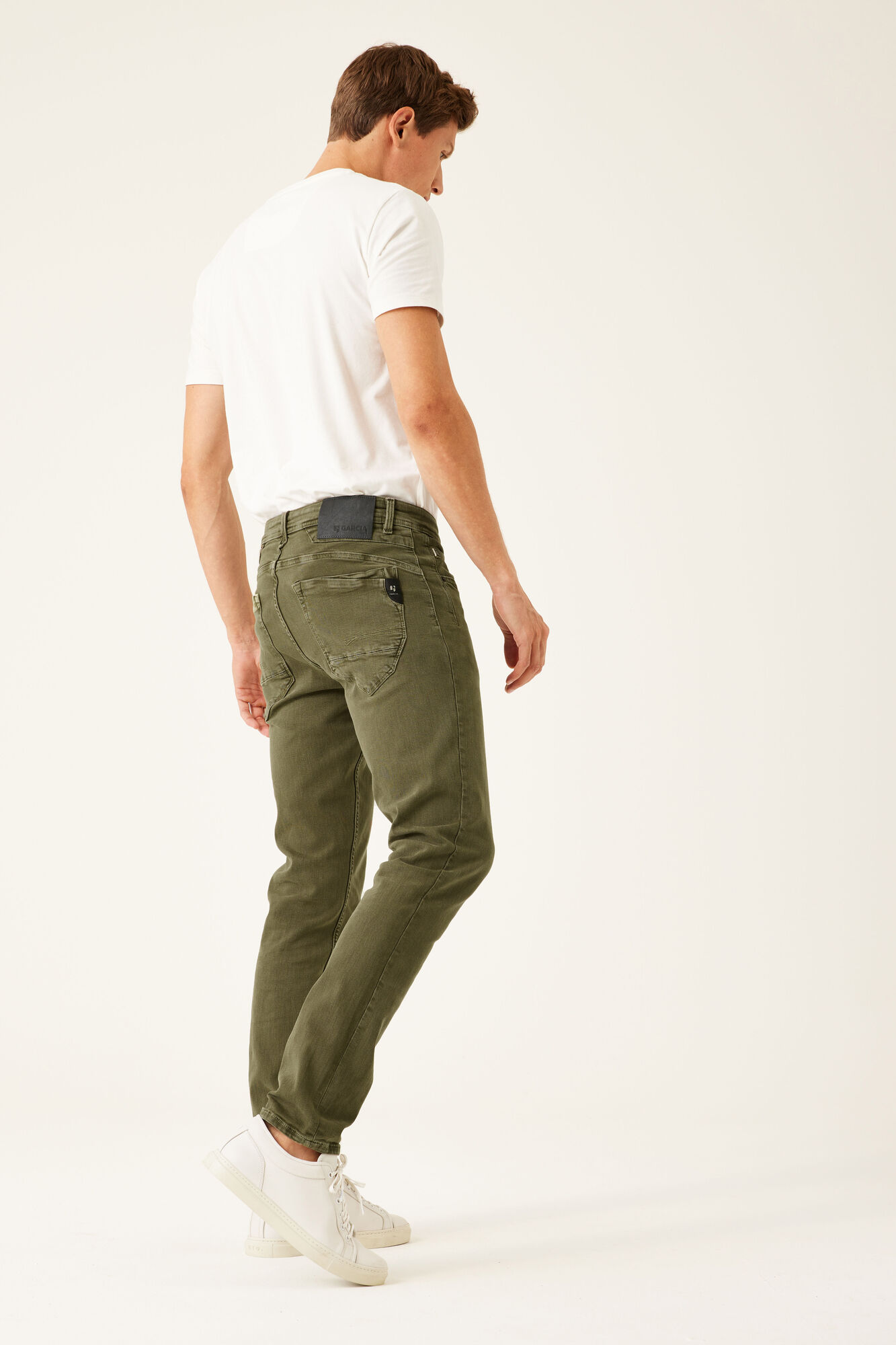 Regular slim fit, mid-rise pant accompanied with a button & zipper closure. Featuring garment-dyed base army colour.