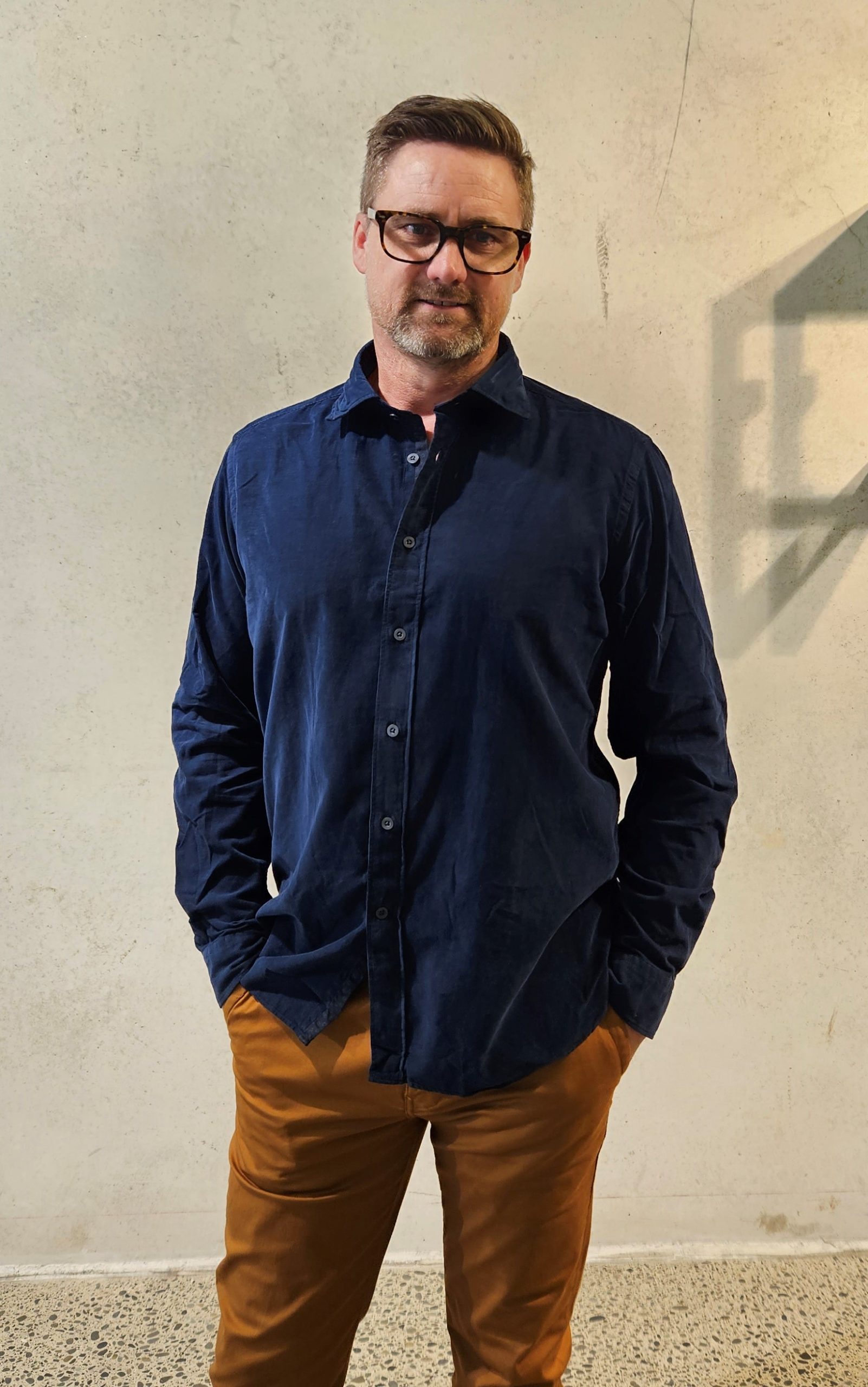 This long sleeve collared shirt with cord fabric, is a button down shaped fit. The cuffs can be buttoned or rolled up, depending on the occasion.