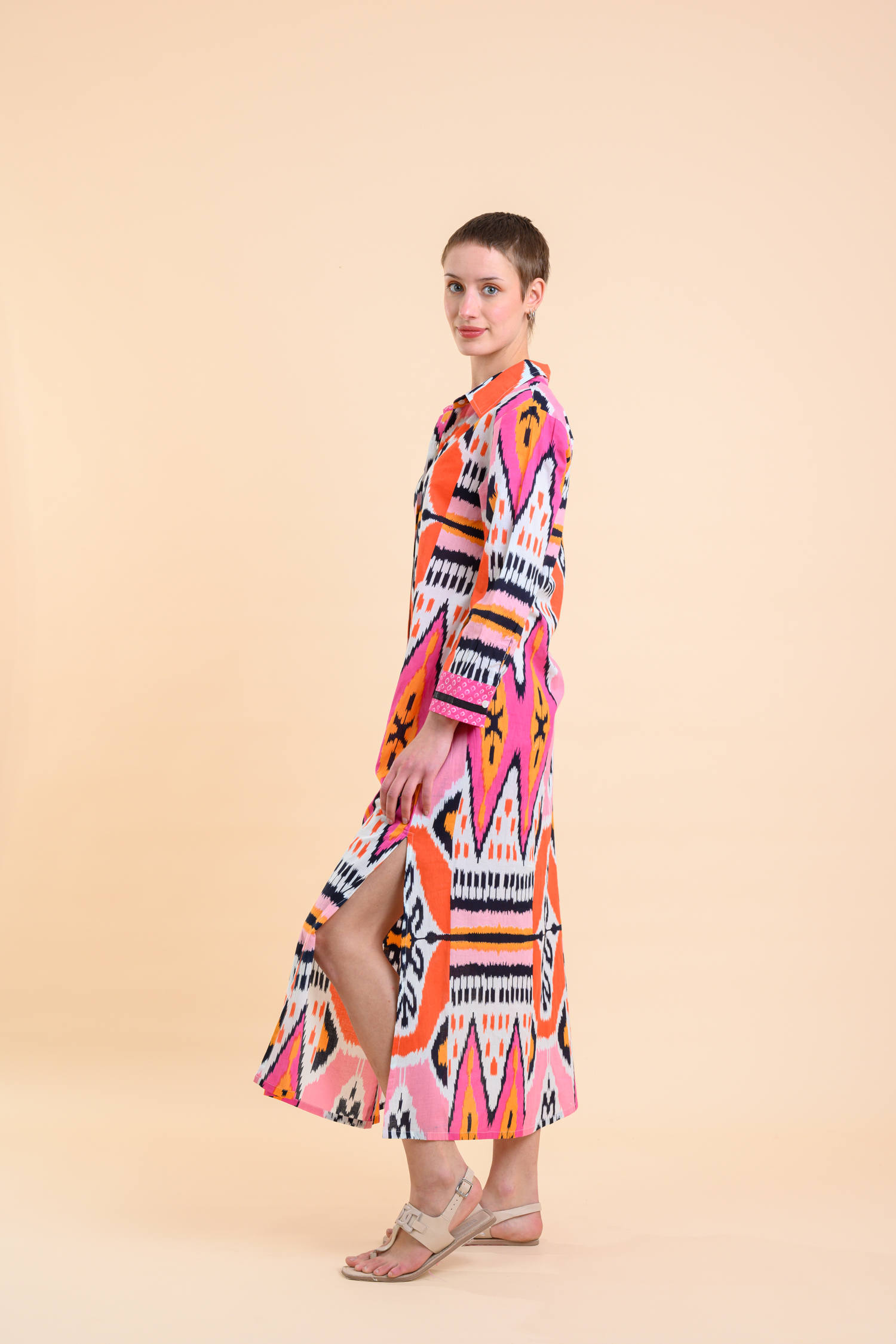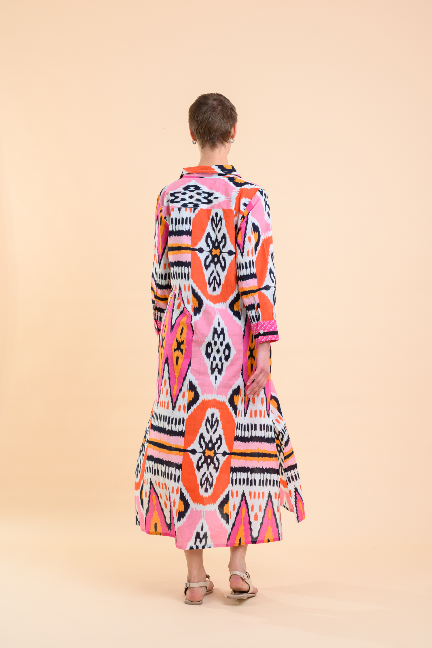 A midi-length, relaxed fit dress, featuring a parket ikat pink pattern, button up fastening, long sleeves and side pockets. All combining to make this dress a summer favourite.