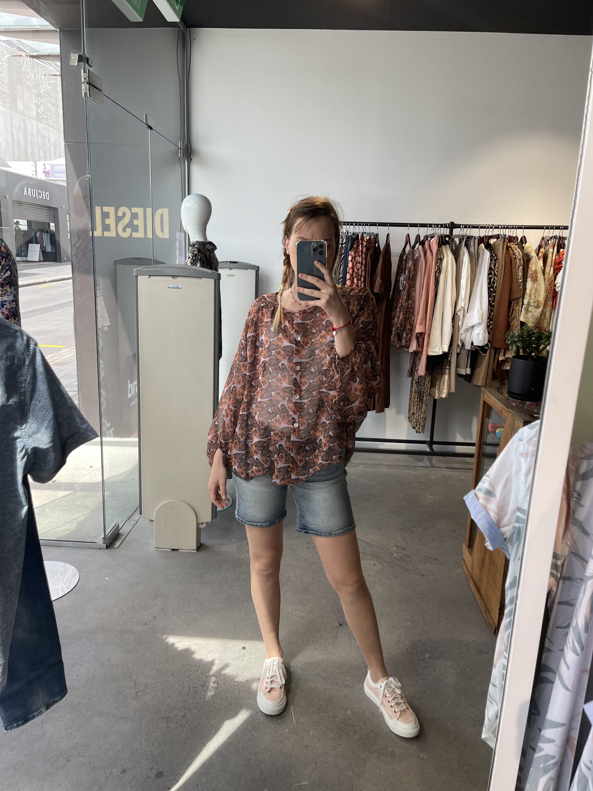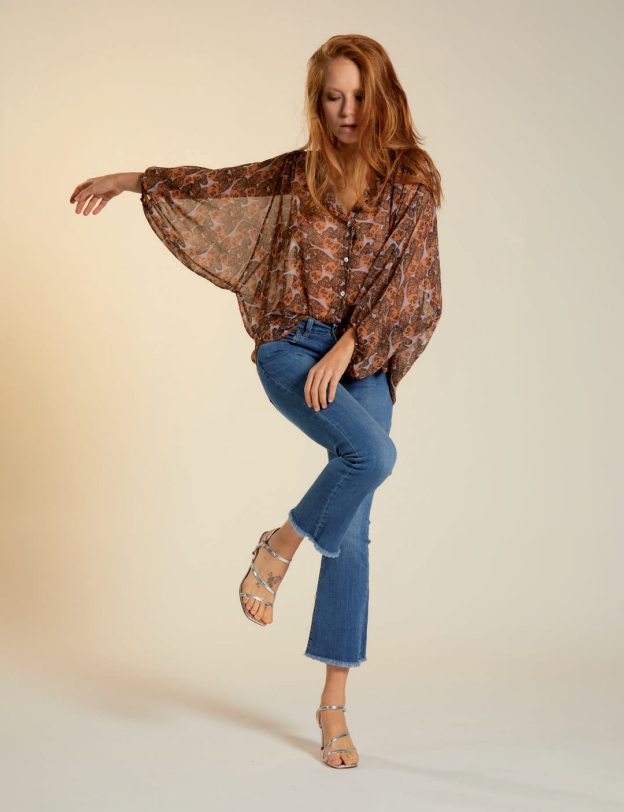 A lightweight blouse featuring long loose sleeves with V-neck & button closure.