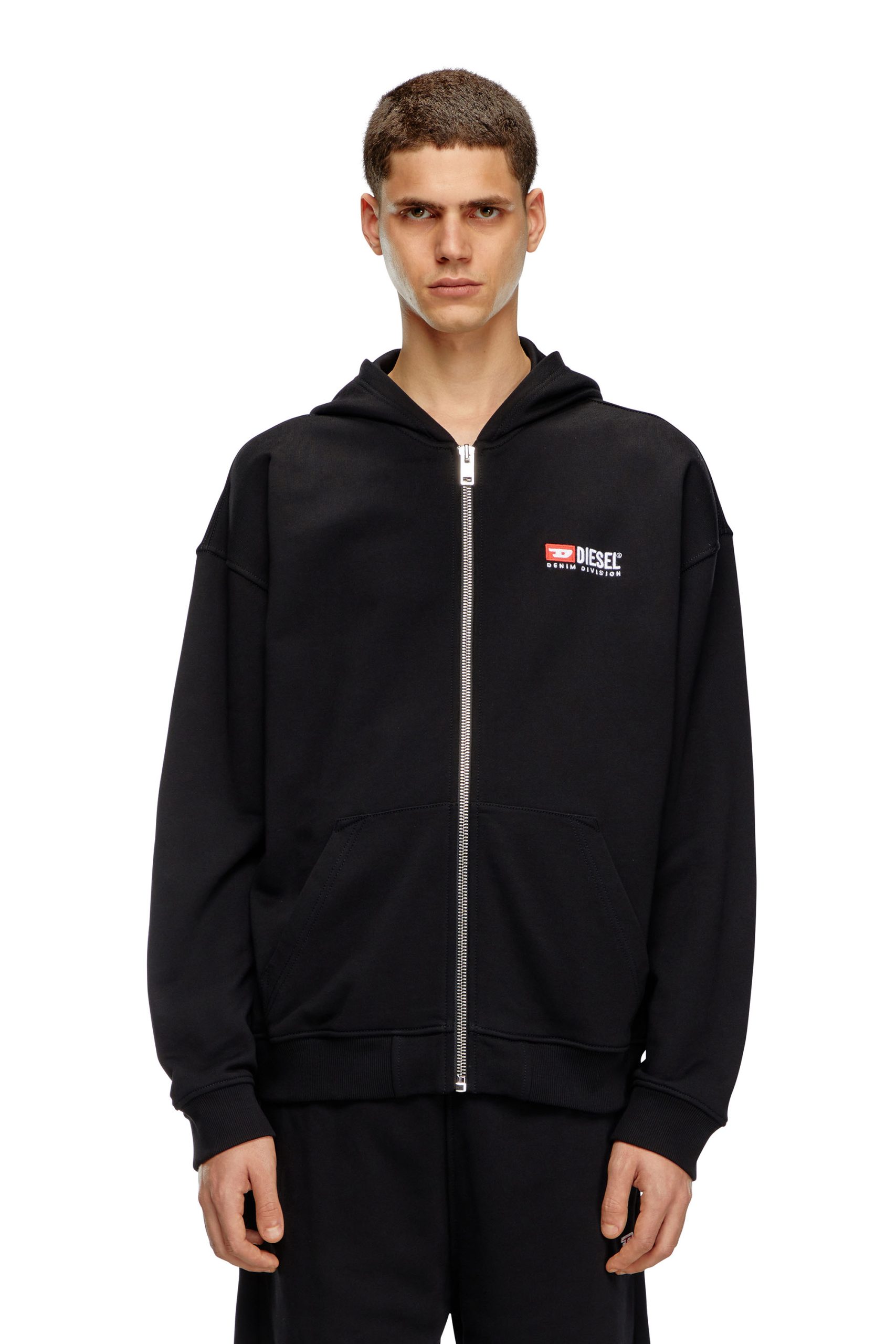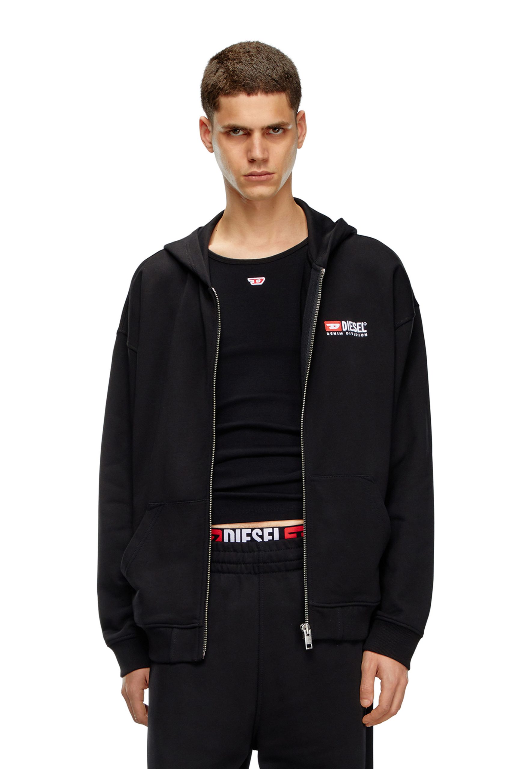 A relaxed fit, zip through hooded sweatshirt. Featuring an embroidered Diesel Denim Division logo on the left chest.