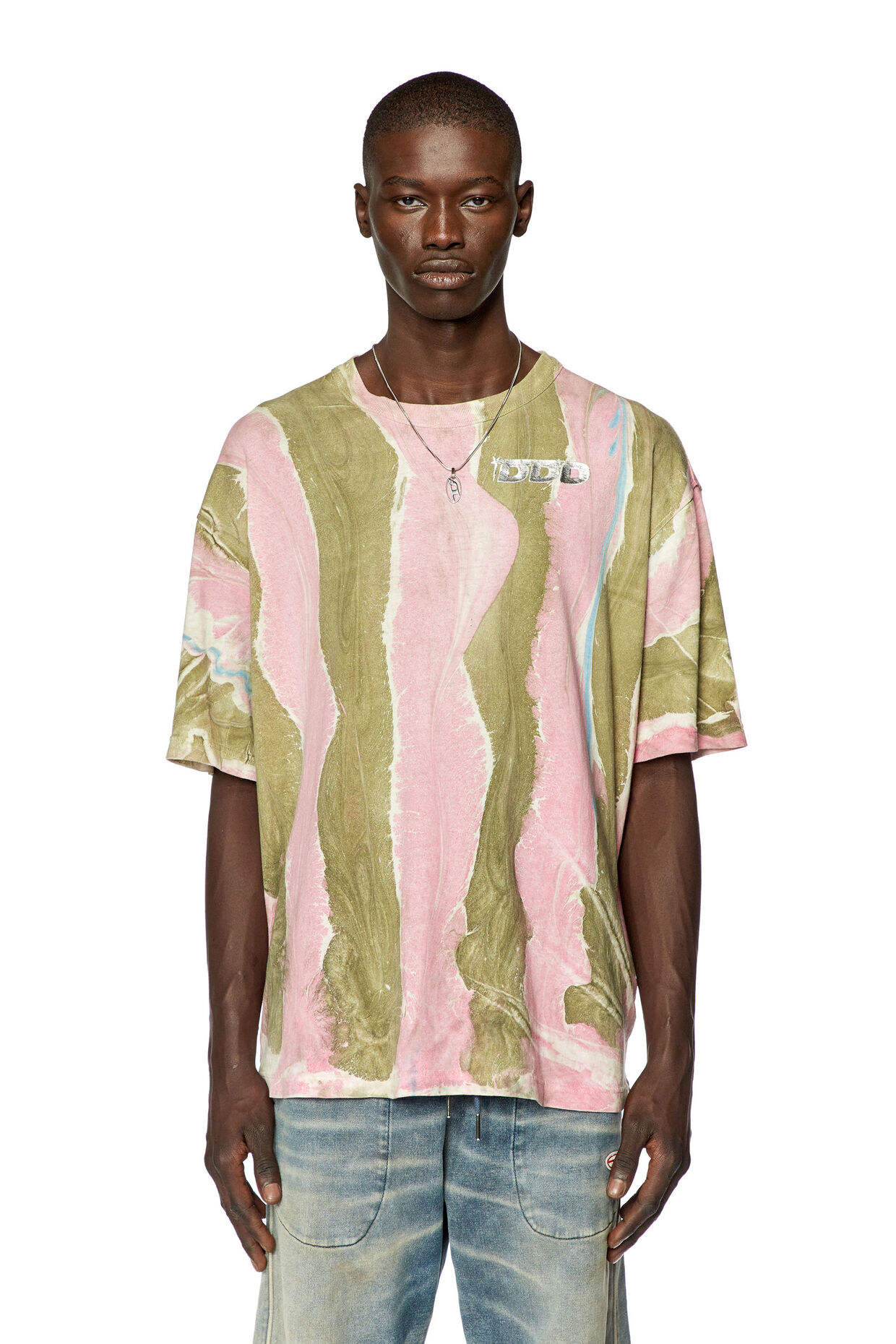 A loose fit cotton jersey tee with ribbed crew neck, featuring marble-effect print & DDD logo print on the chest & foil globe print on the back.