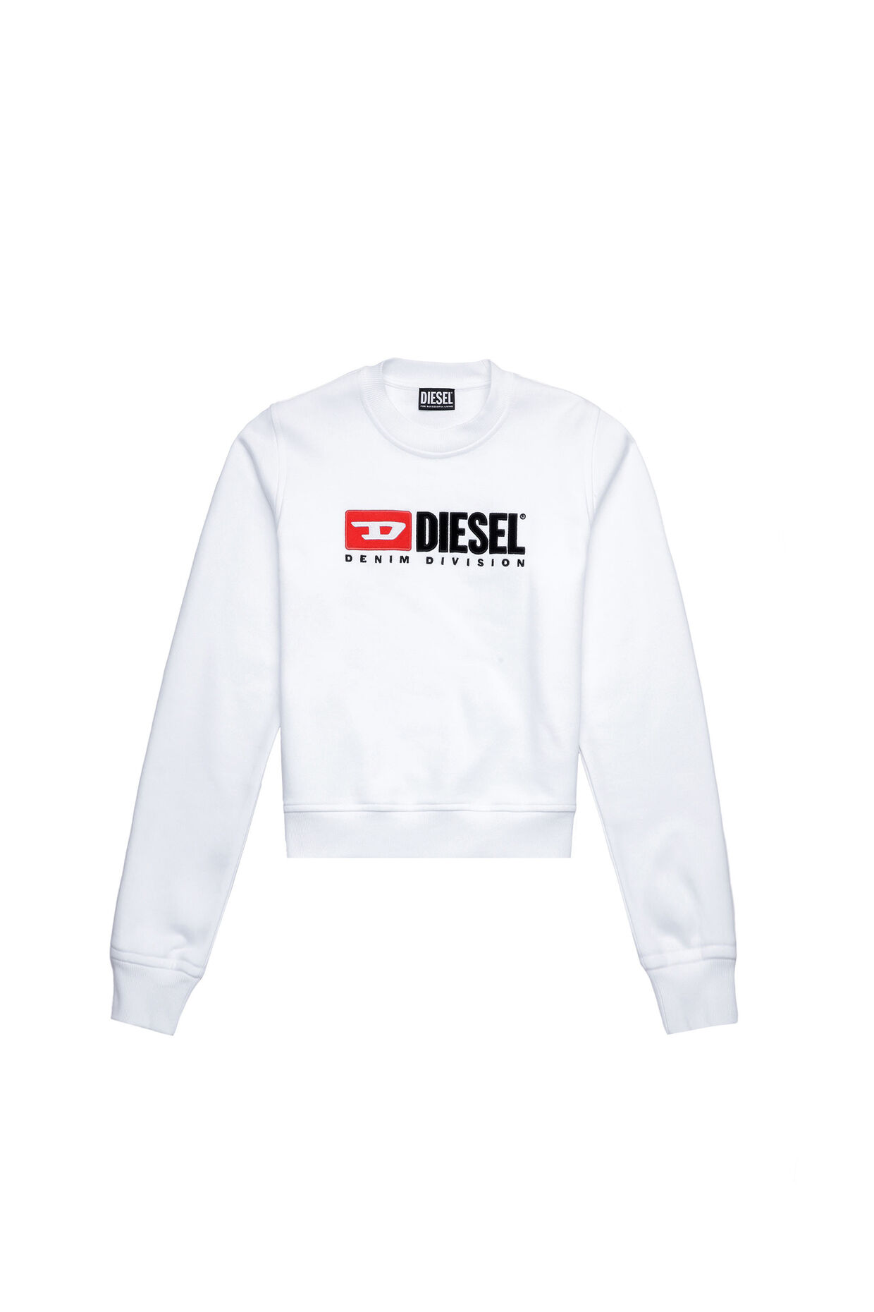 A regular cut sweatshirt with ribbing at the hem & cuffs. Featuring a graphic Diesel Denim Division logo on the chest.