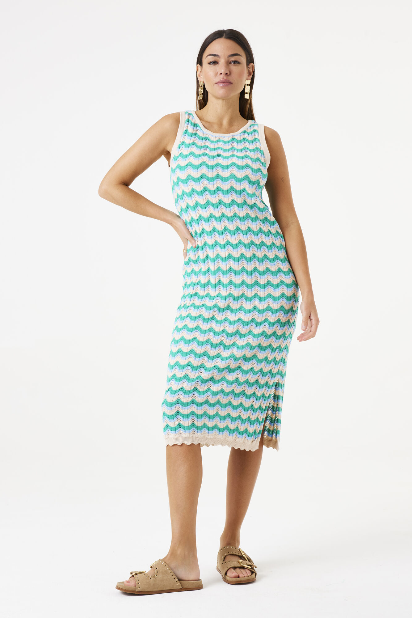 A relaxed fit, midi length knitted dress. Featuring a wide shoulder straps & round neckline.