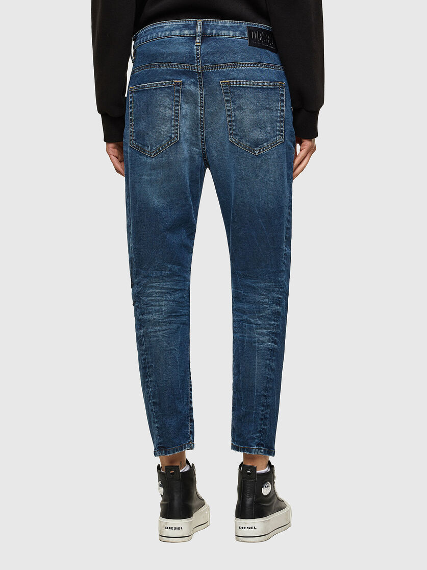 Boyfriend style jean with low waist and low crotch with a zip fly, finished in a dark blue wash.