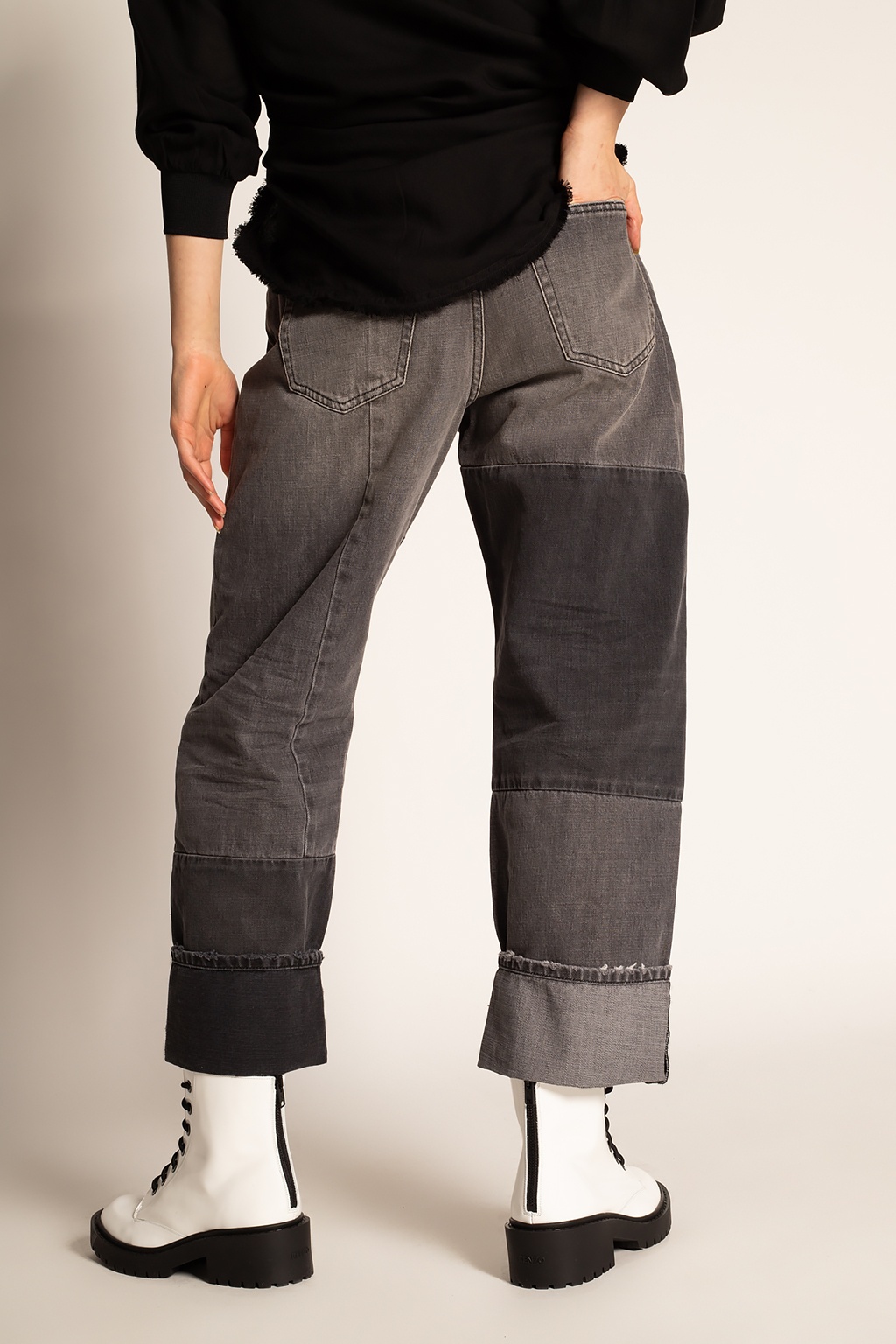 Straight style jean with high waist. Slightly relaxed crotch, straight leg and zip fly, finished in a black/grey wash.