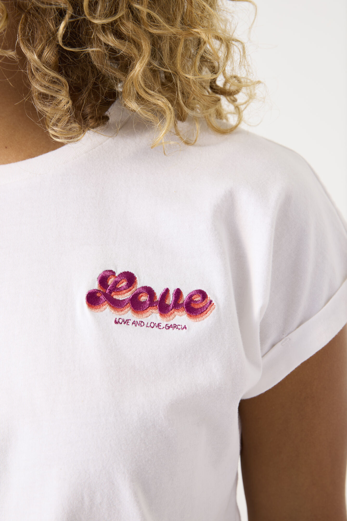 A dropped shoulder fit, short-sleeved tee with a round neck. Featuring a small “Love” chest print.