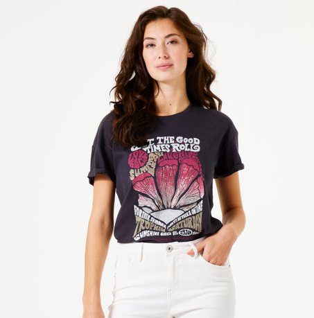 A dropped shoulder fit, short-sleeved tee with a round neck. Featuring a graphic chest print.
