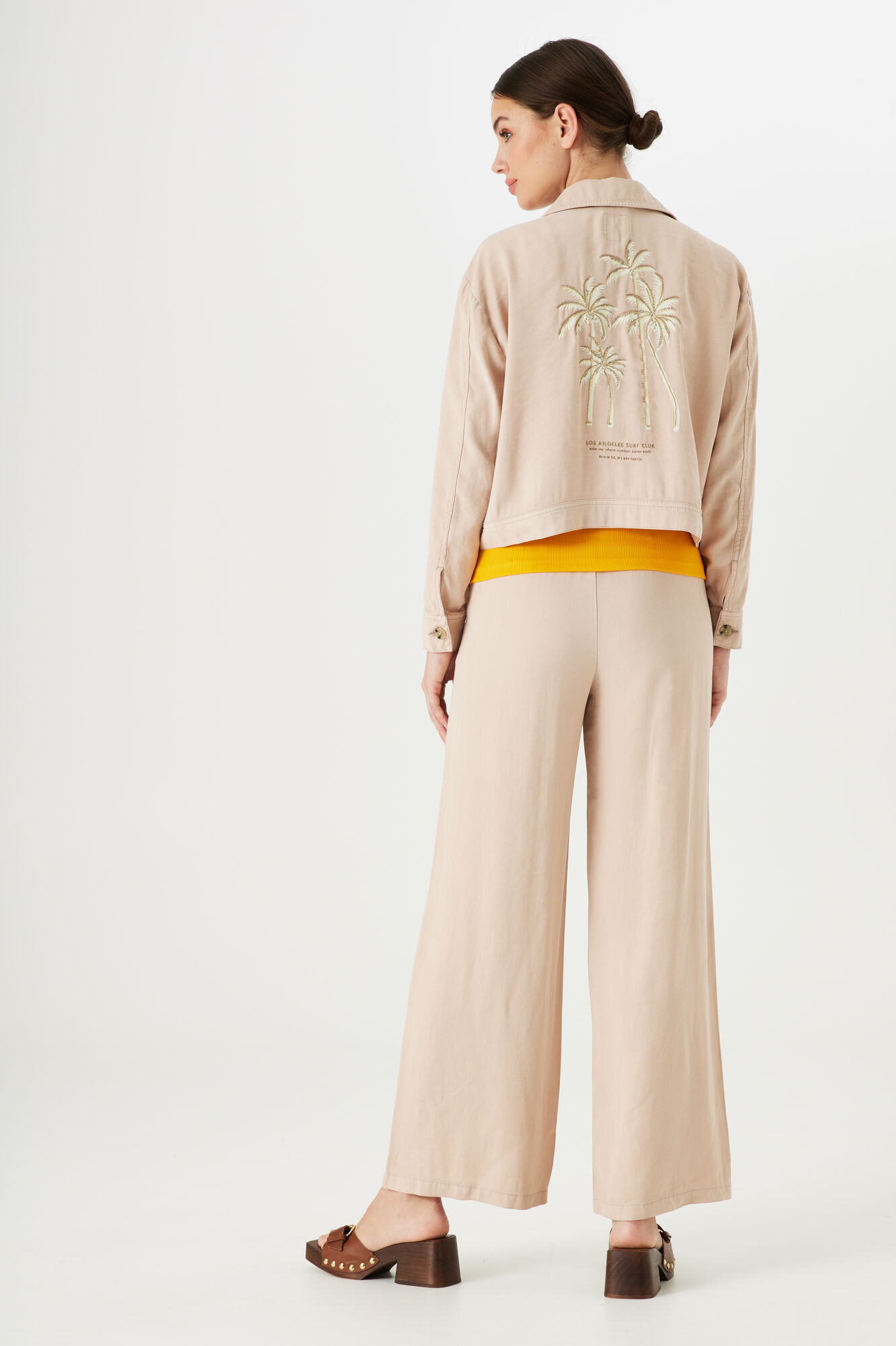 A regular fit, cropped jacket, featuring an embroidered palm trees on the back. Chest pockets & button closure.