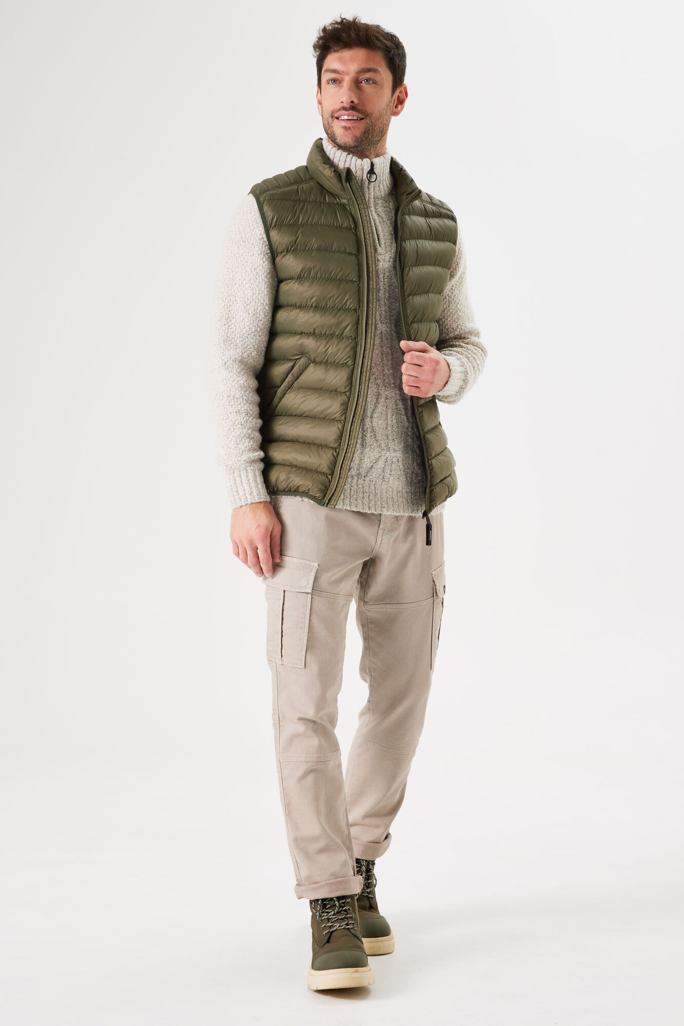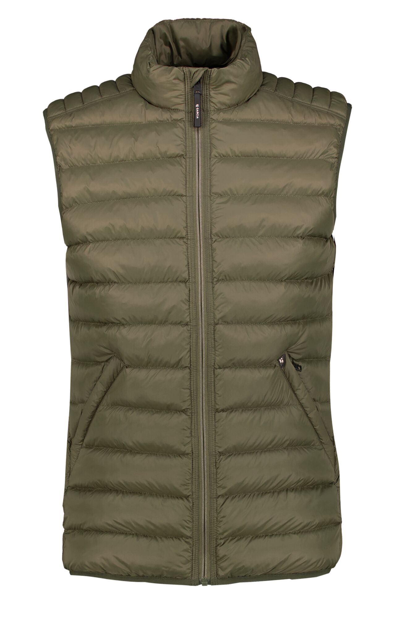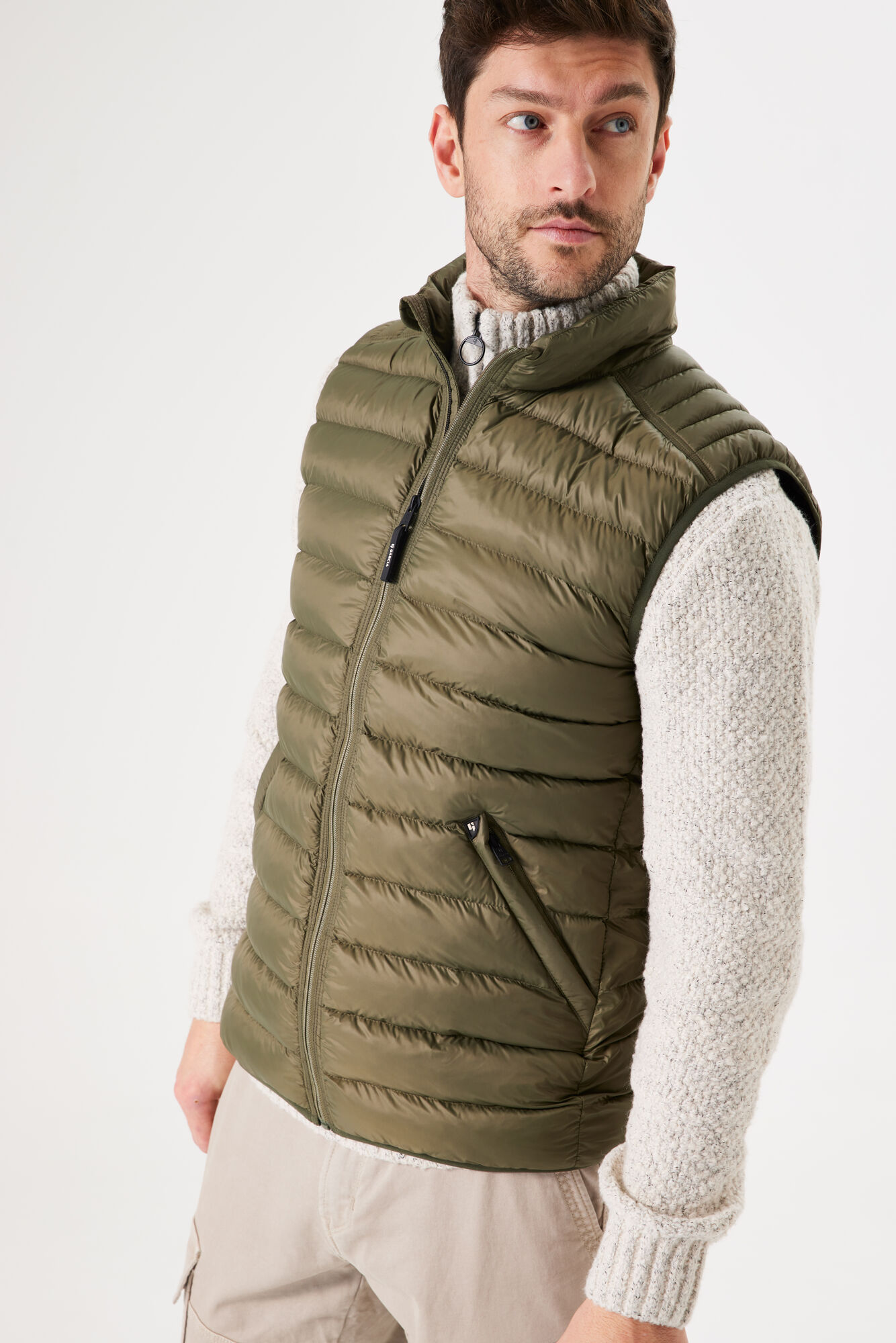 A lightly padded vest made from water repellent material. Featuring a stand-up quilted collar, pockets & zip closure.