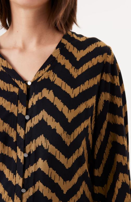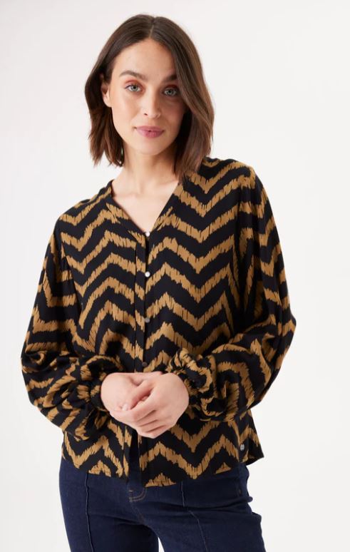 A regular fit blouse, featuring an all-over graphic print, V neck & button-down closure.
