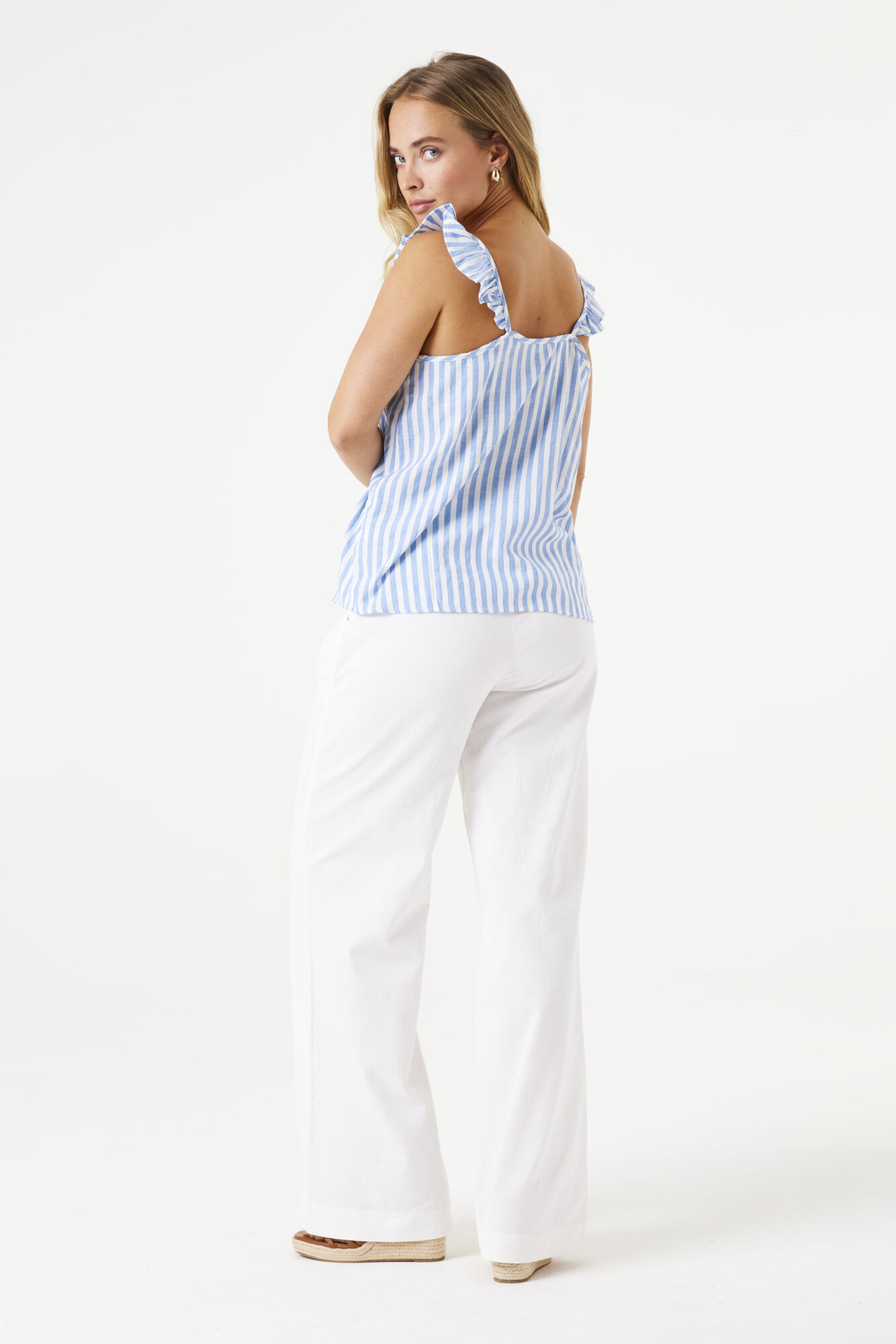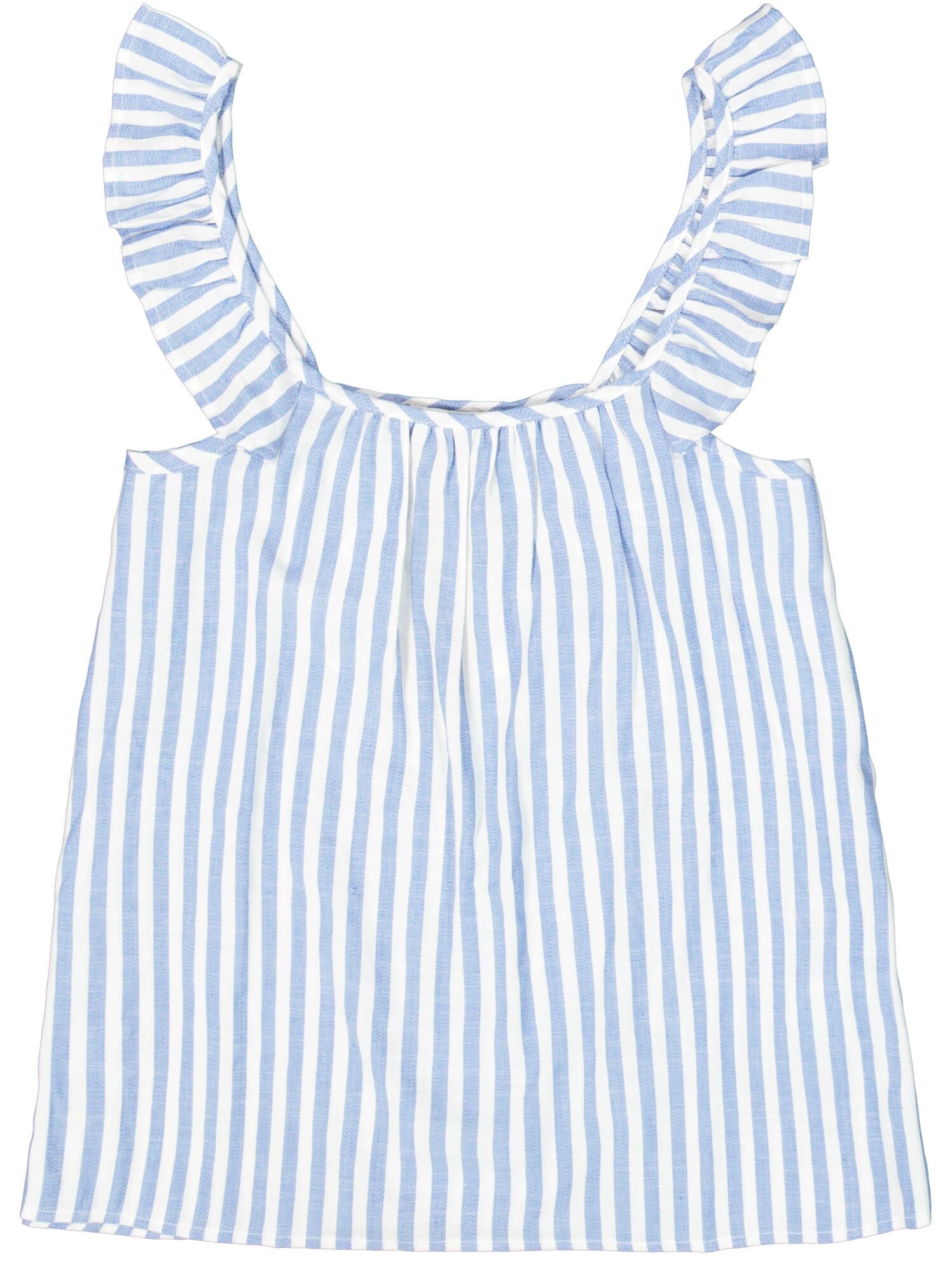 A relaxed fit singlet featuring wide, ruffled straps & striped print.