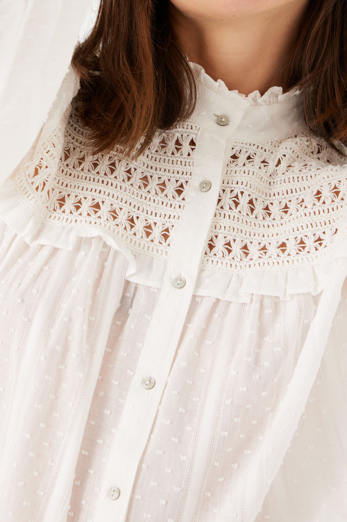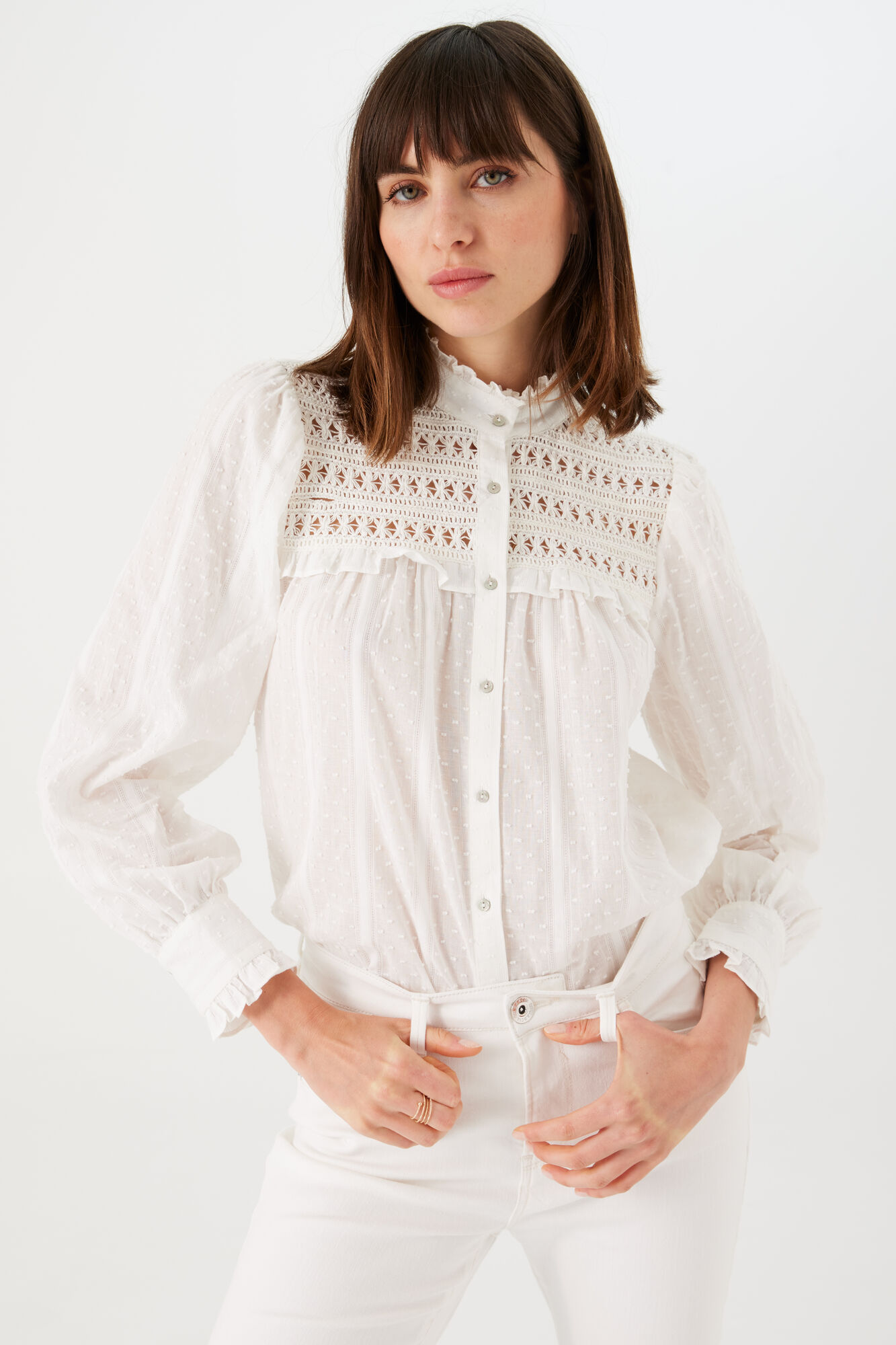A regular-fit, button-down closure blouse, featuring a standing collar & embrodiery detailing.