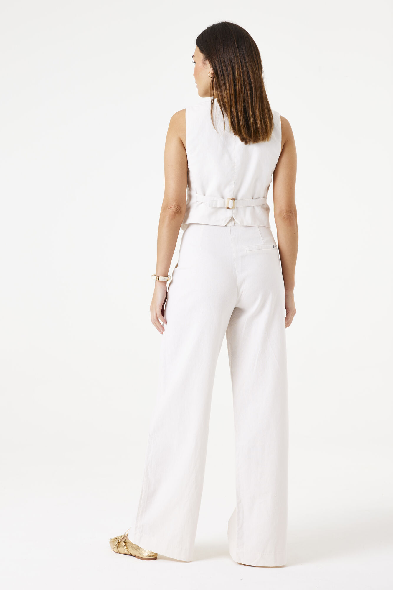A wide fit pant with a high waist with button & zipper closure.