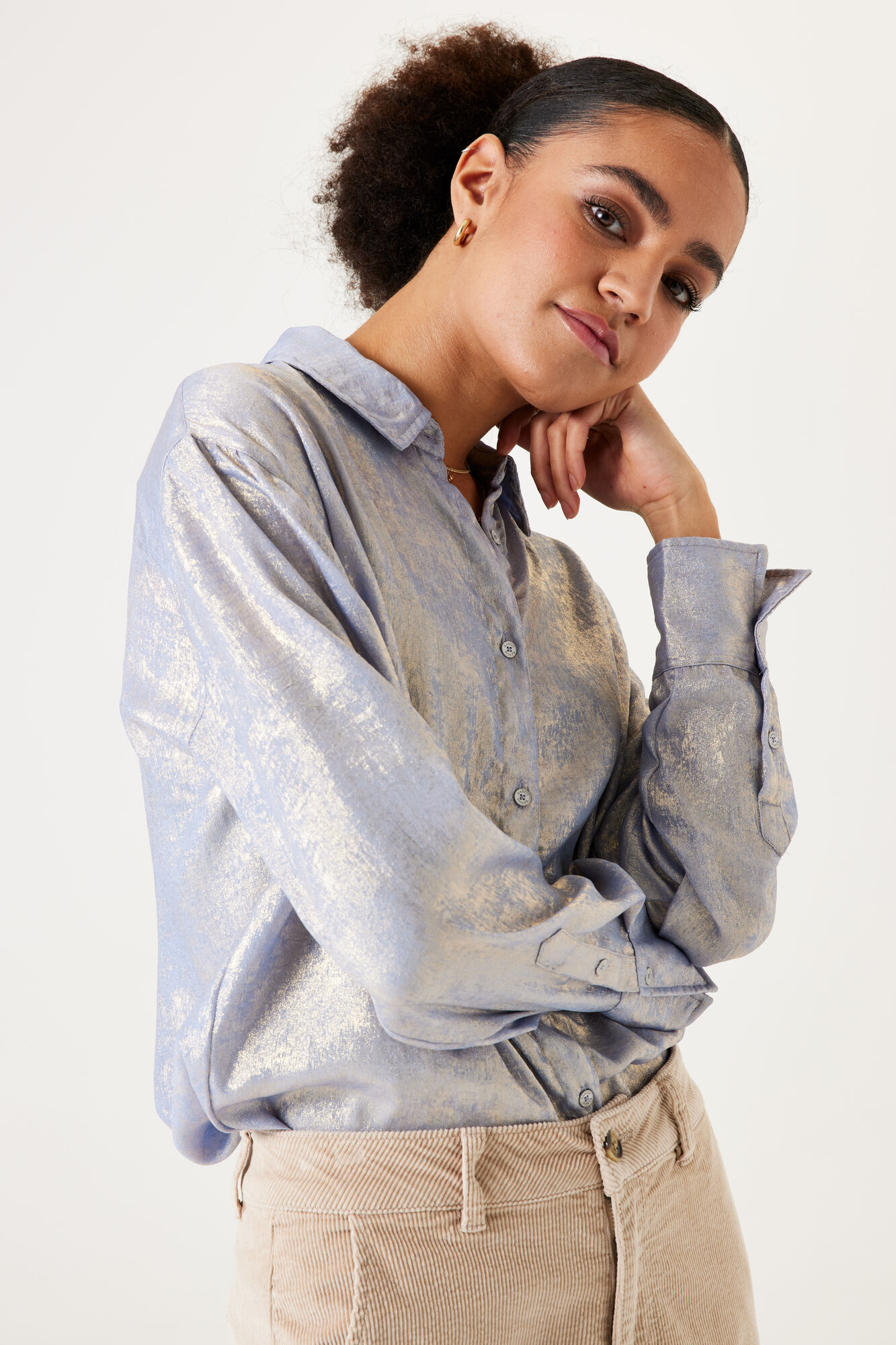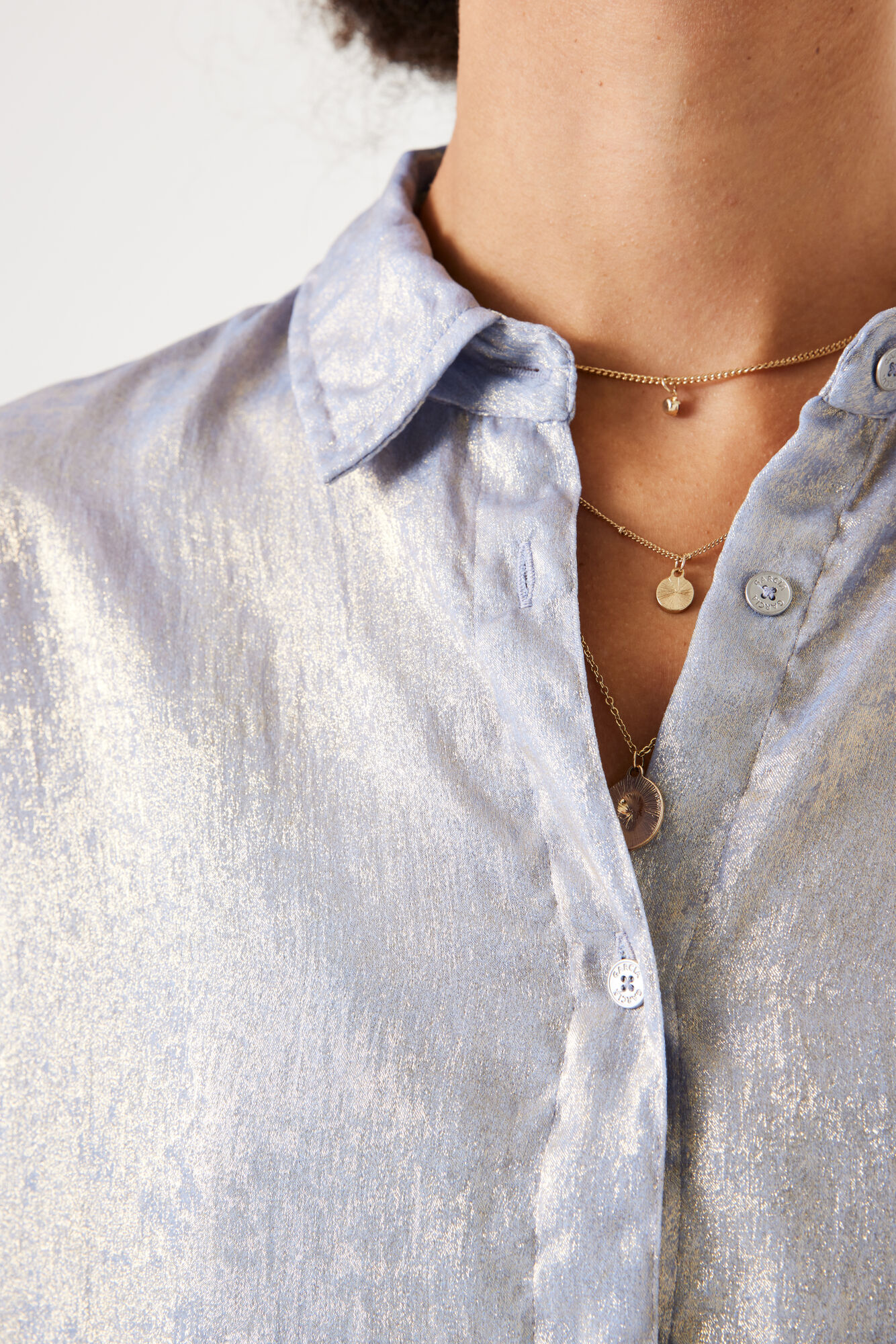 A relaxed fit, long sleeved blouse. Featuring a classic collar, button down closure & all-over glitter.