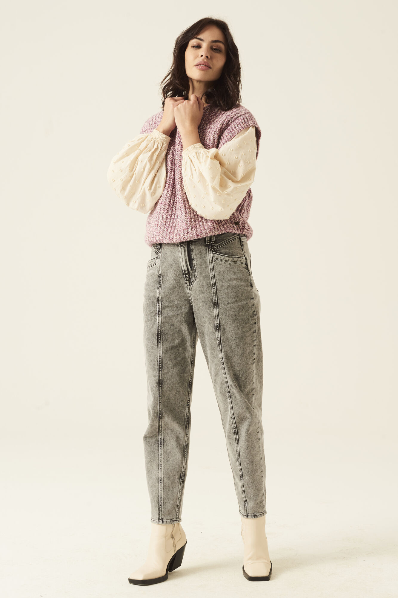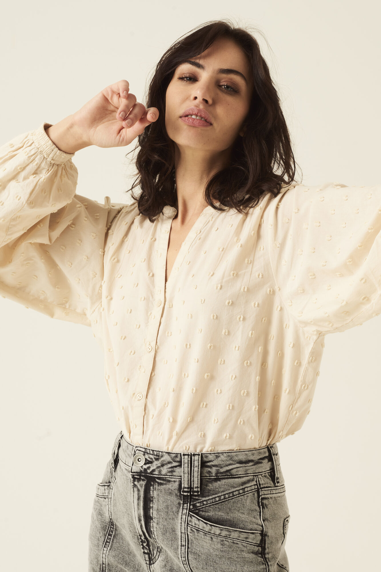 An oversized dobby blouse with long sleeves, V-neck & button closure.