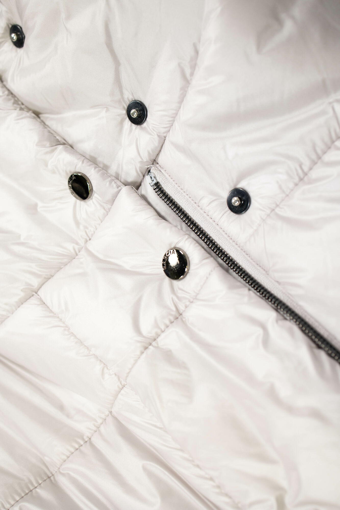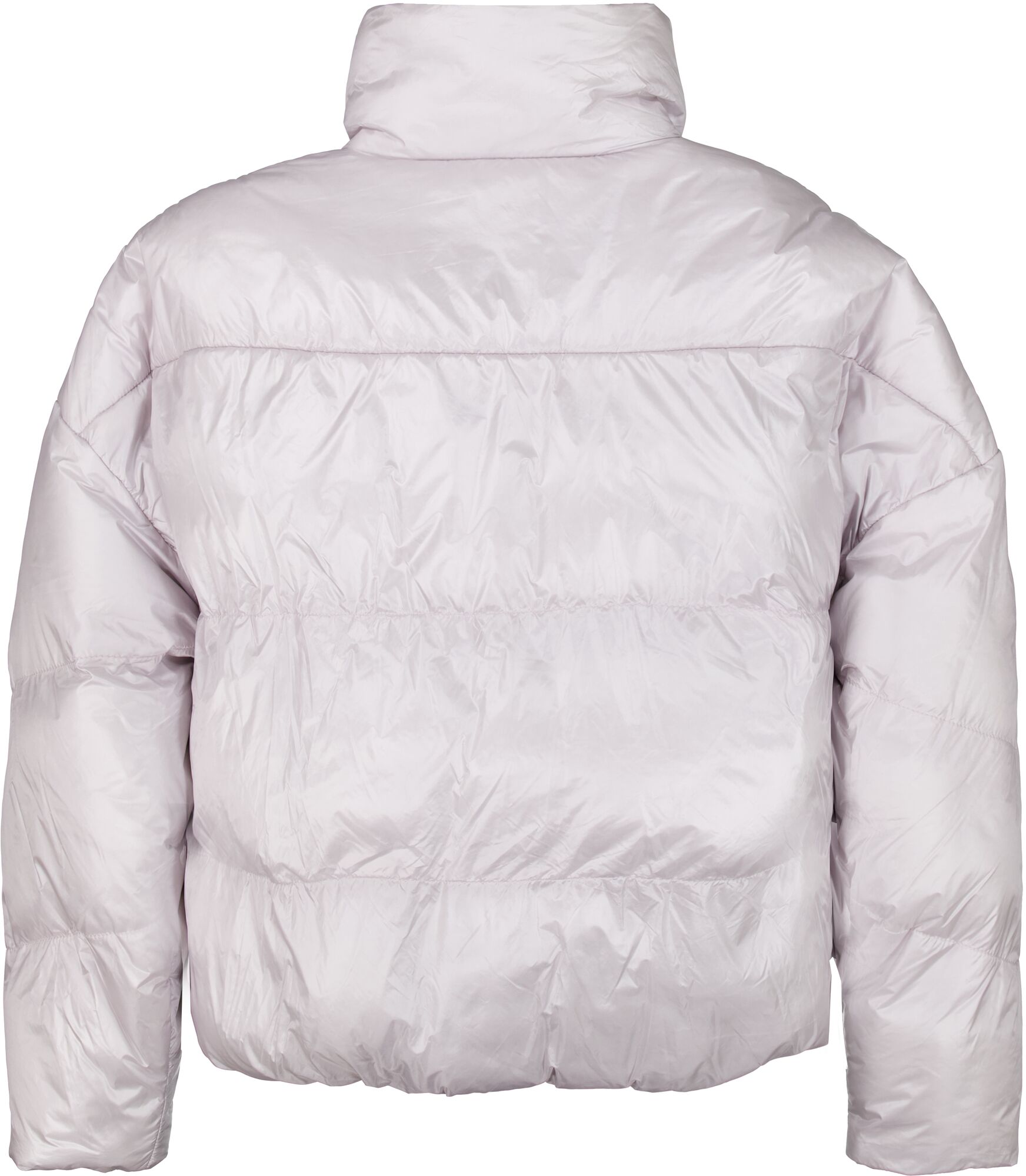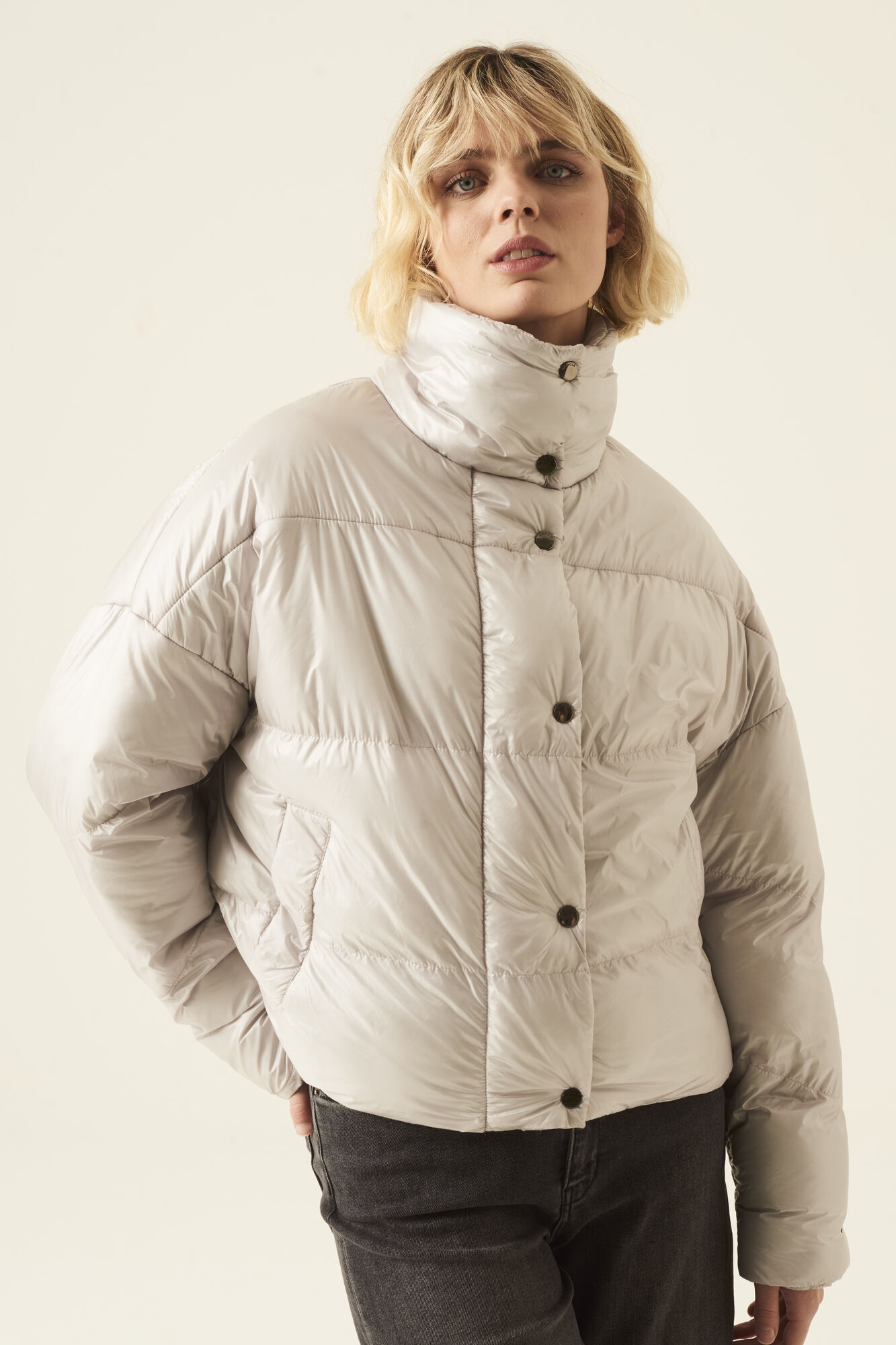 A puffer jacket featuring cropped look with zip and snap button closure.