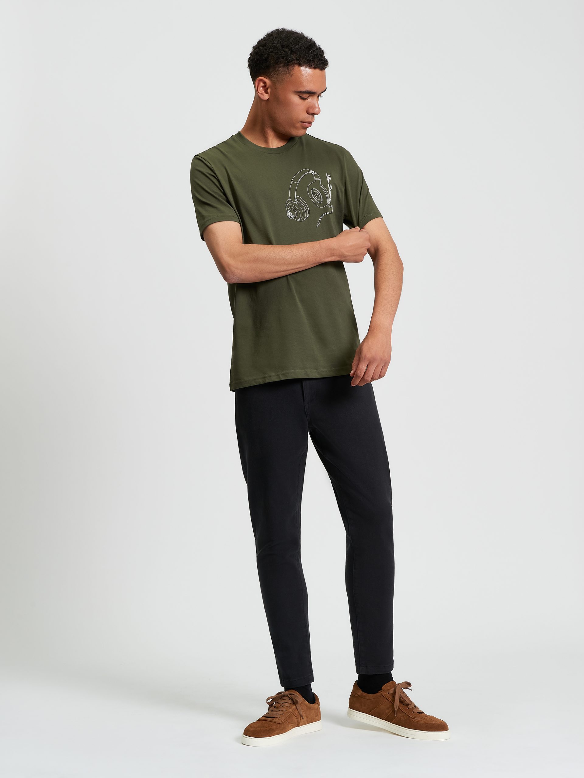 A short-sleeved tee with a regular fit, the Headphone Tee delivers a subtle nod to the music scene with a textured high-build headphone print on the chest with signature Ben Sherman branding.