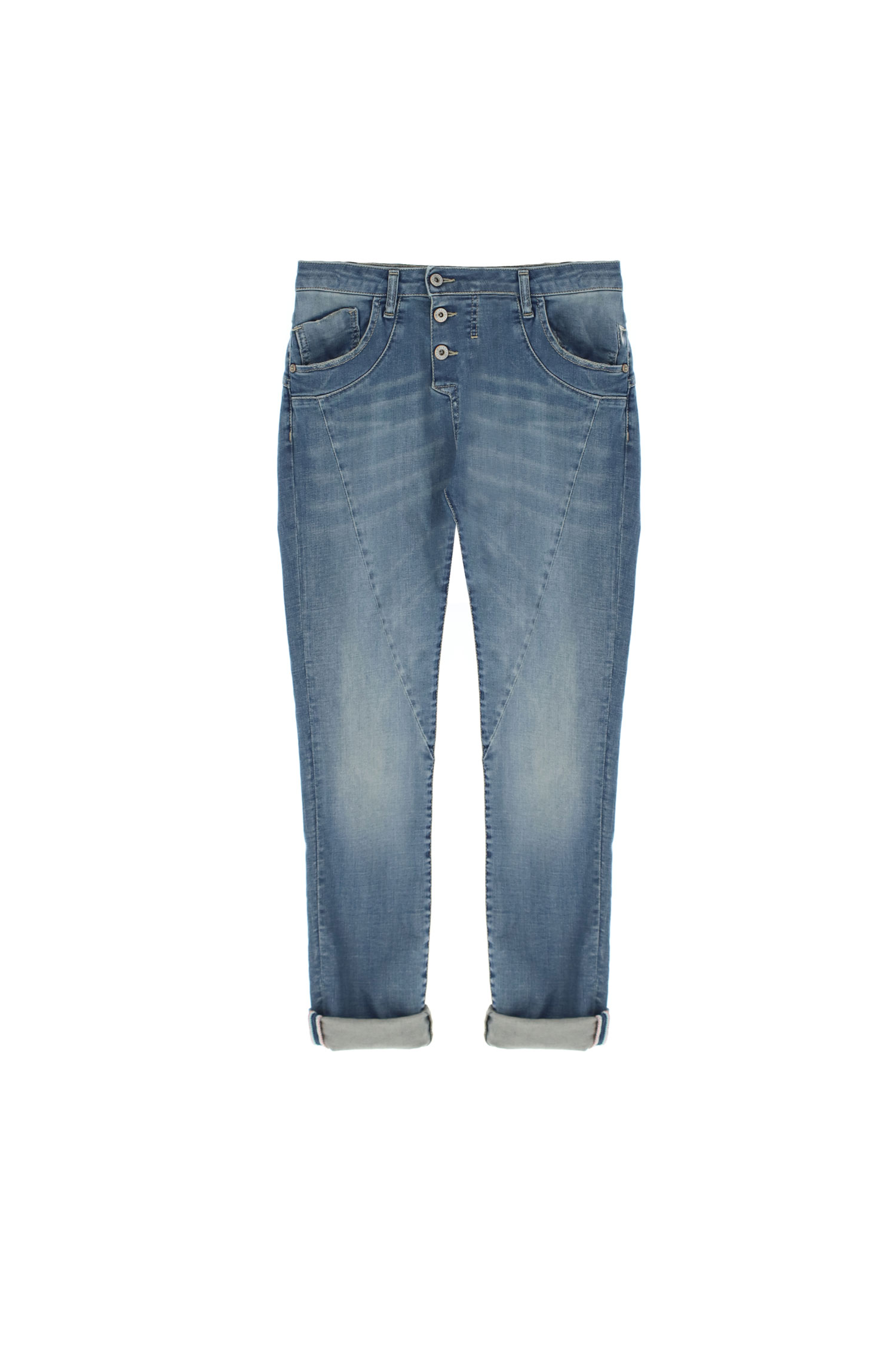 Boyfriend style, medium waist jean accompanied with a button closure, finished in medium blue.