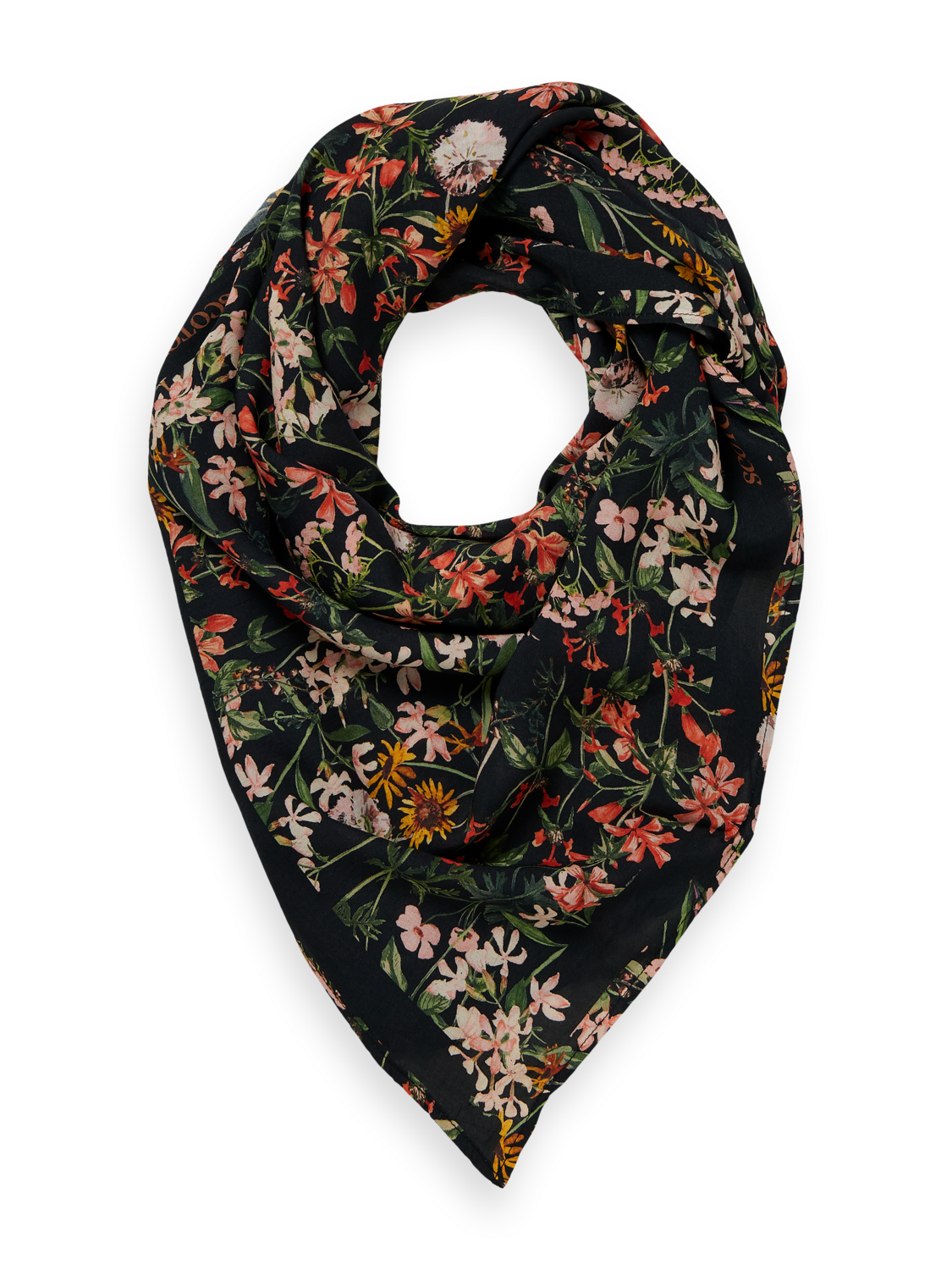 The Scotch & Soda printed scarf is a classic bandana style featuring a stunning meadow print.