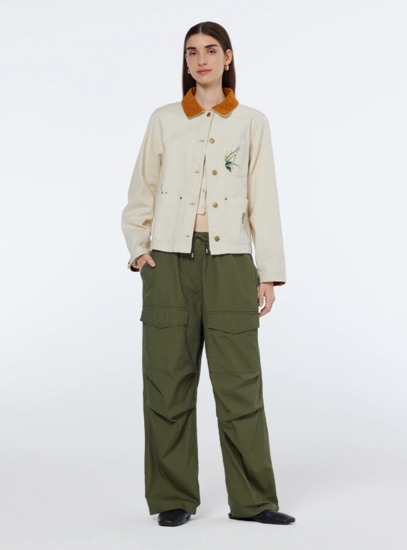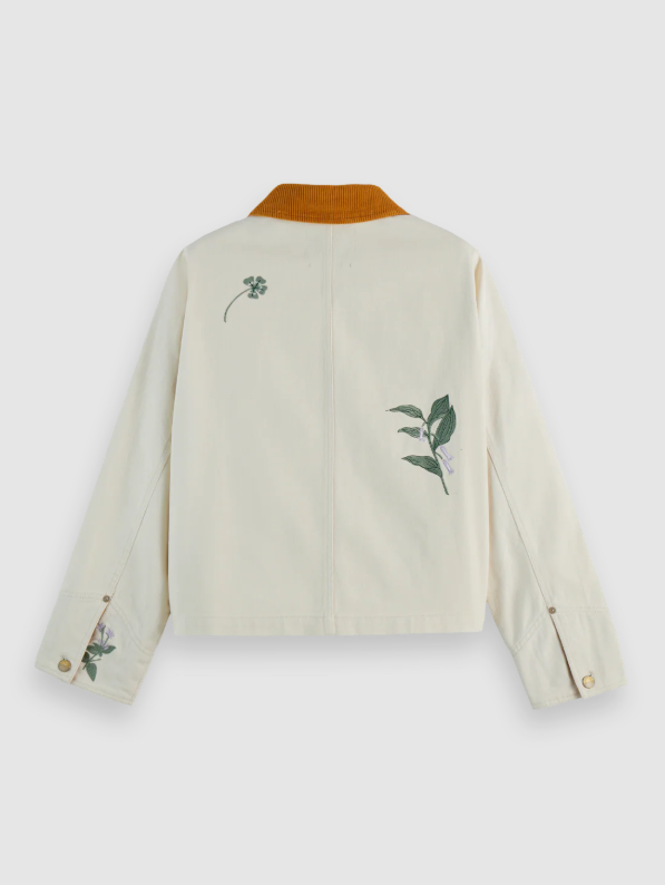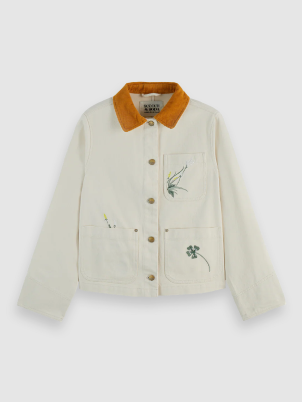 Am embroidered barn jacket featuring contrasting colour collar, button down closure & cuffs, chest & side pockets.