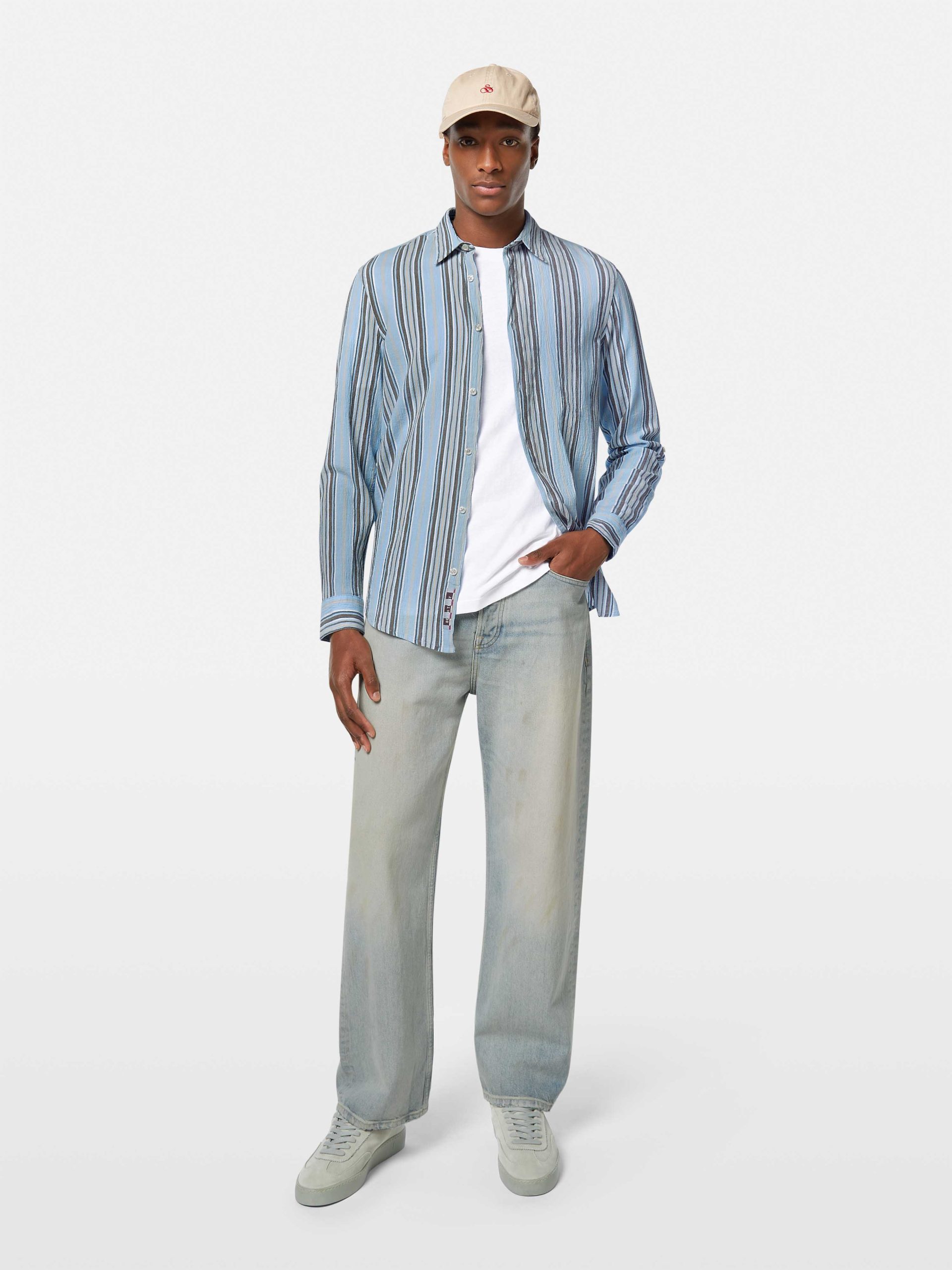 A long-sleeved, relaxed fit shirt. Featuring a crinkle-stripe designed for effortless style.