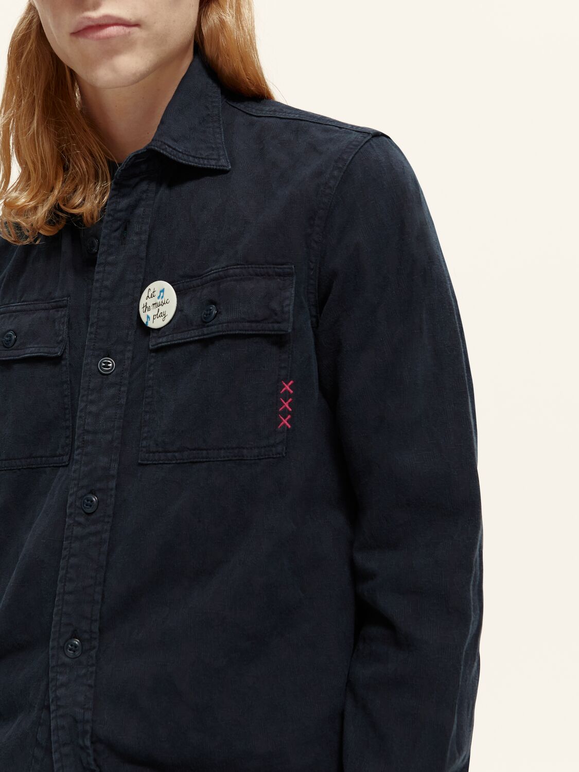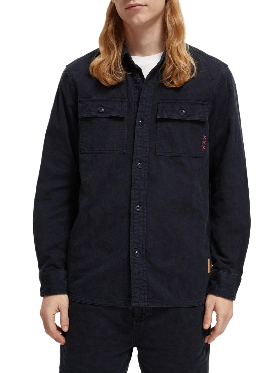 A garment dyed, jacquard overshirt featuring chest pockets & a small Scotch & Soda logo on the chest.