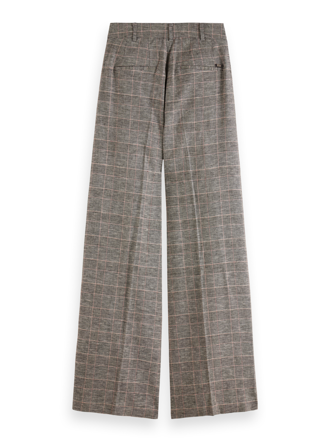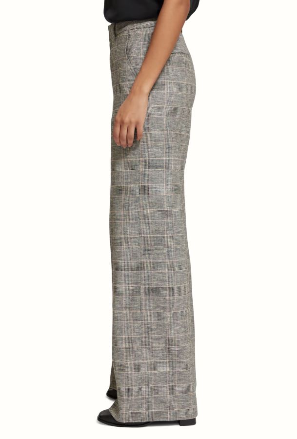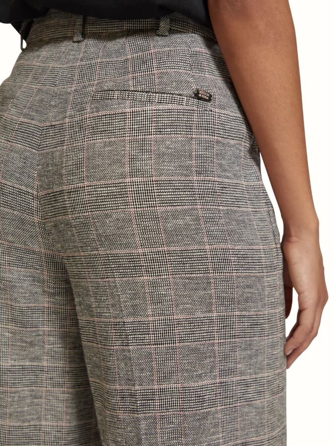 A high-rise, wide-leg pant featuring side pockets, welt back pockets & hook & eye closure. With a hint of stretch these prince of wales checked motif pants are made for all day comfort..