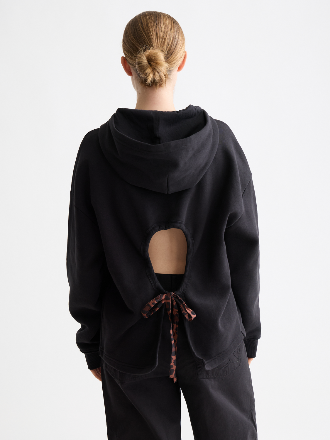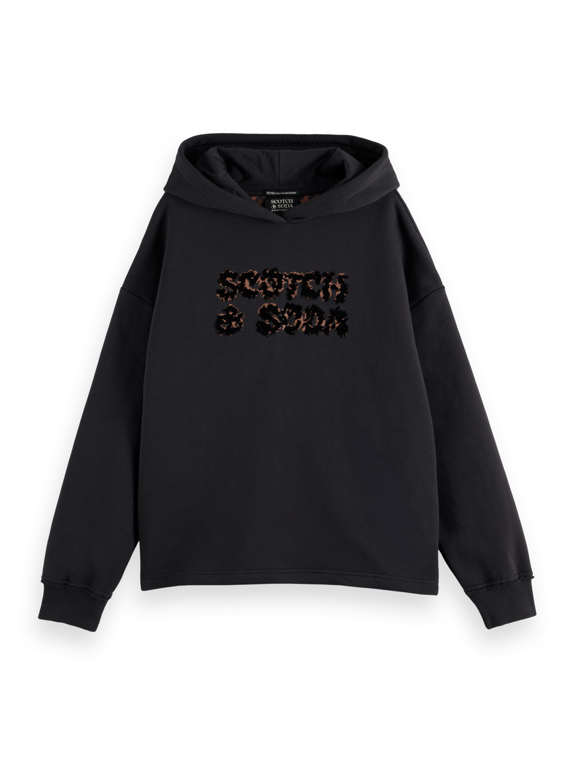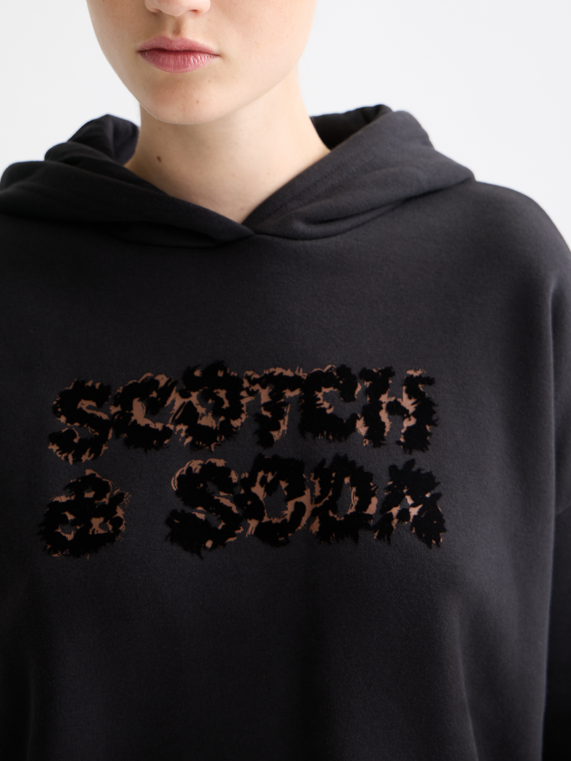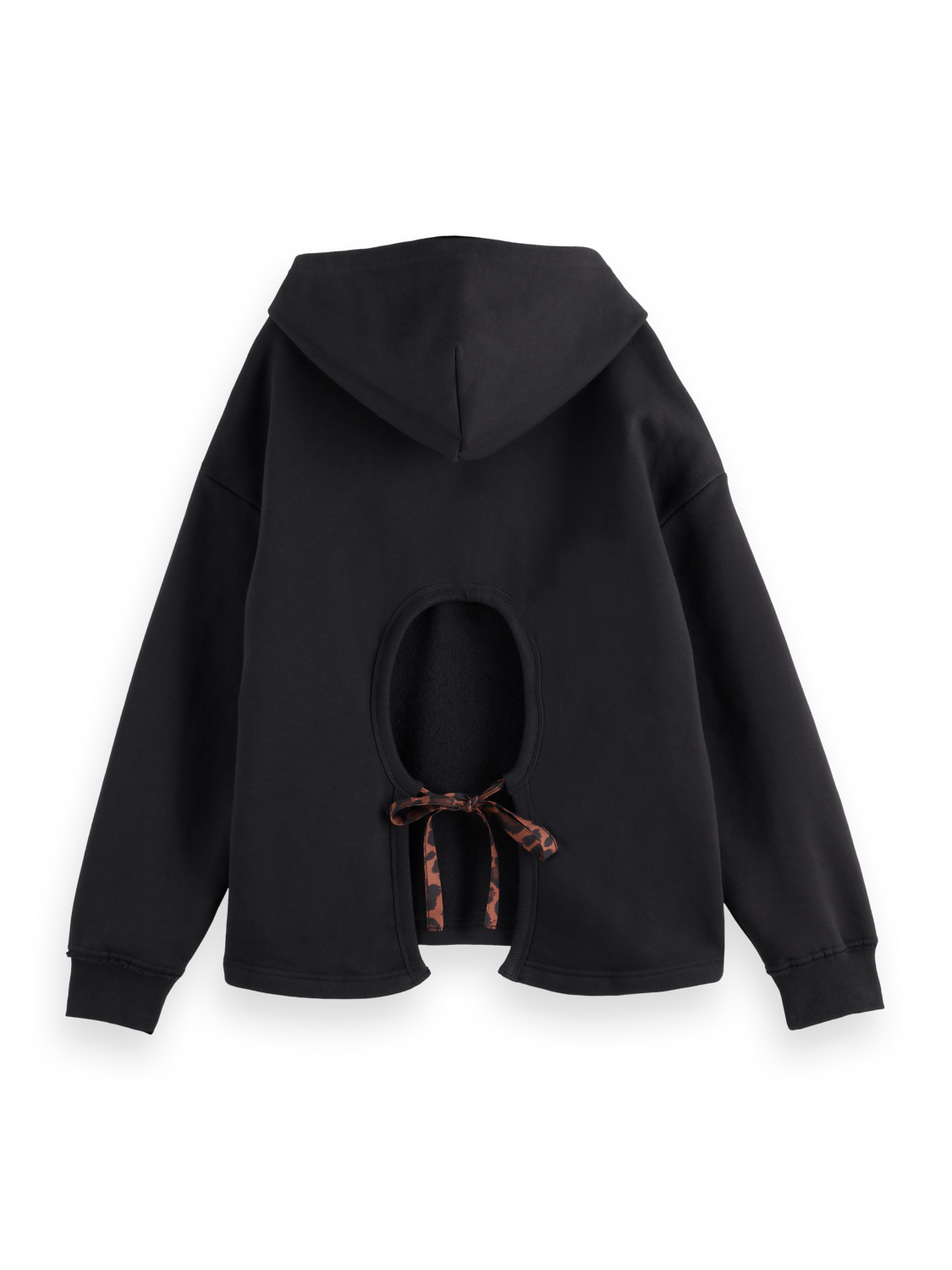 A regular fit, long sleeved hoodie. Featuring a Scotch & Soda print on the front and open back with a tie.