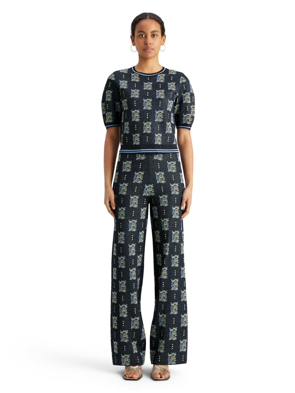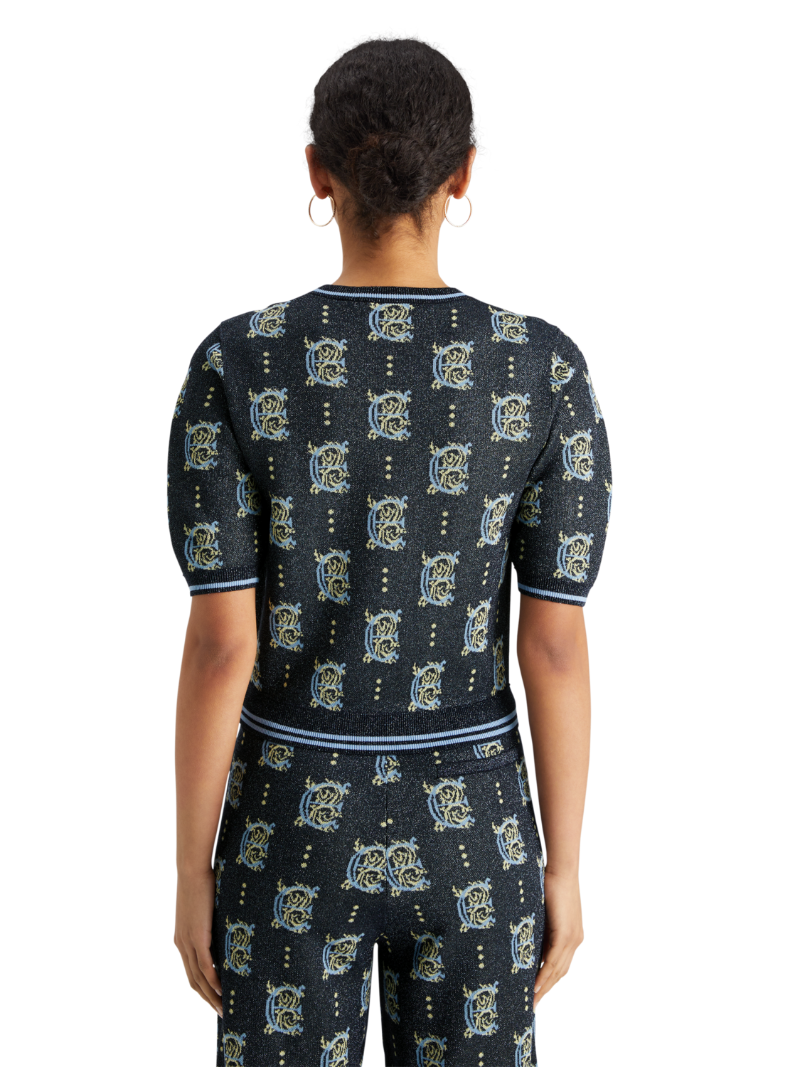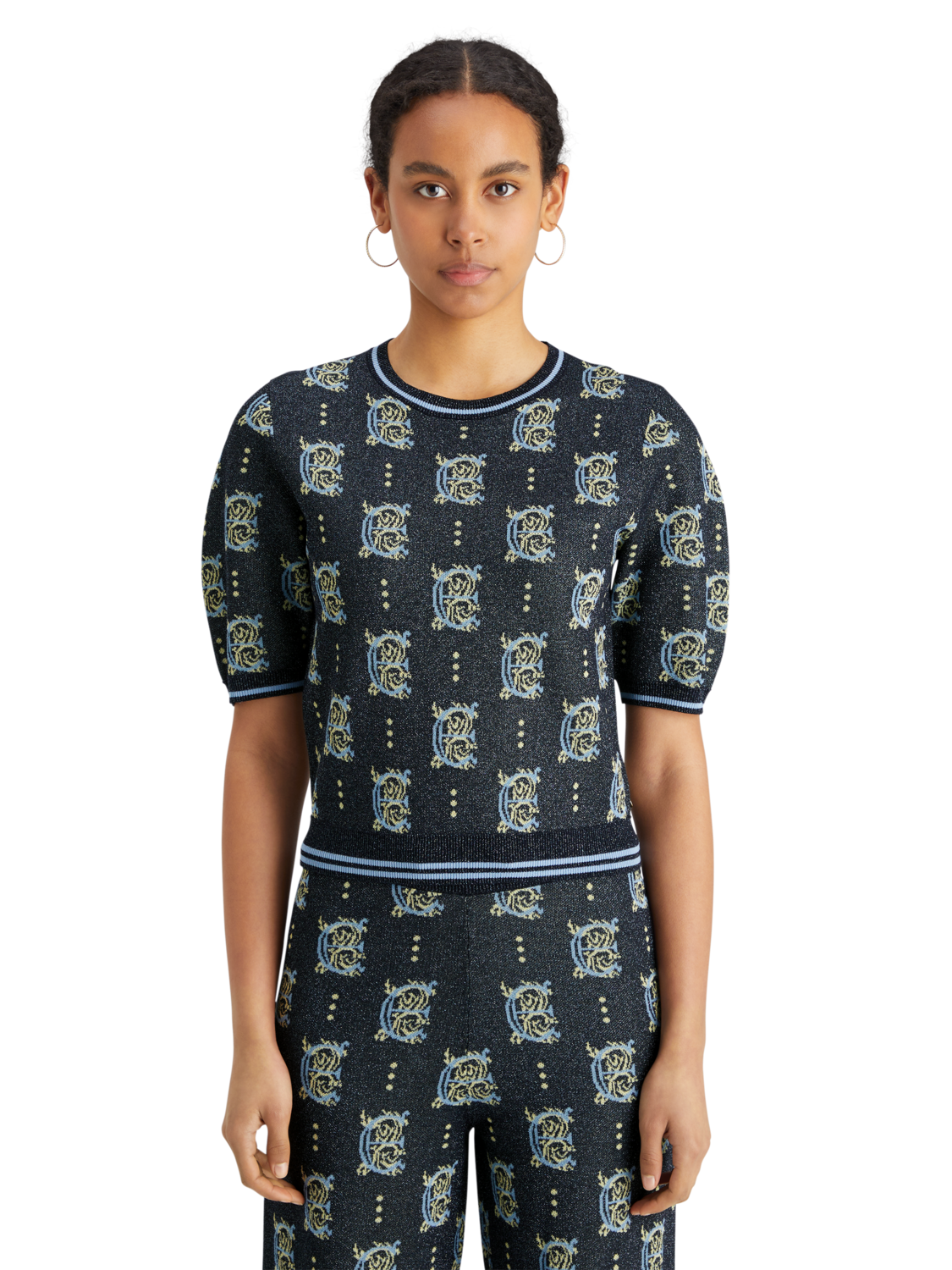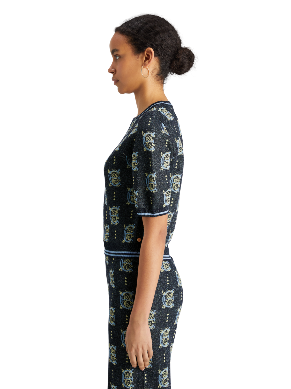 A jacquard cropped top, featuring a bold all-over pattern & short sleeves.