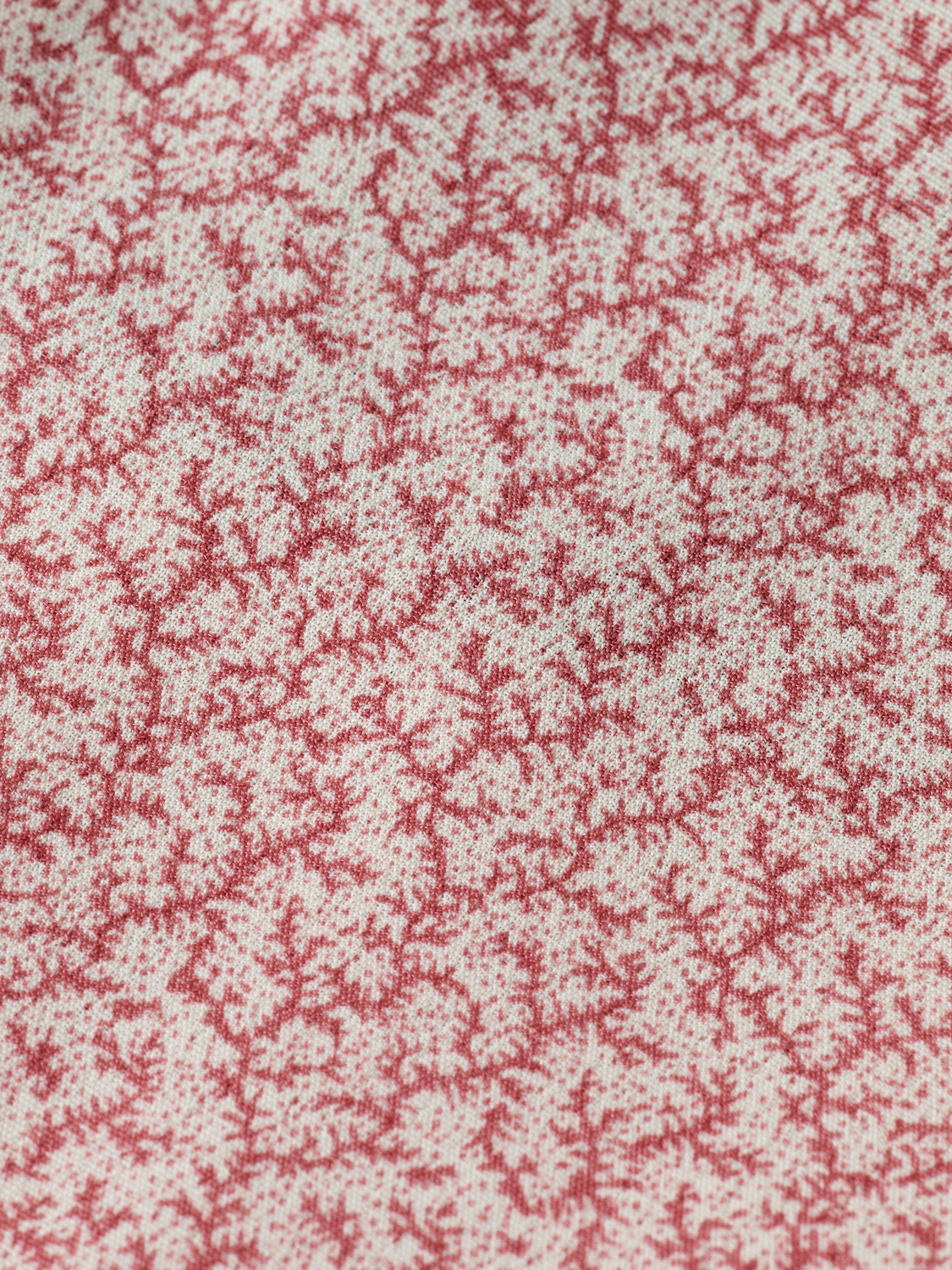 A midi-length dress with elbow length sleeves featuring full button-down closure and a subtle print.