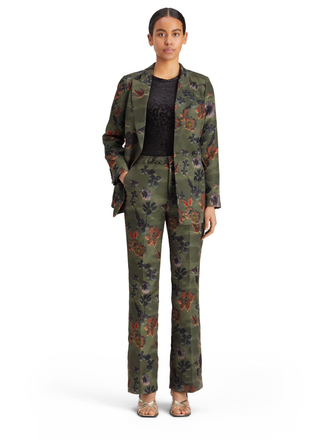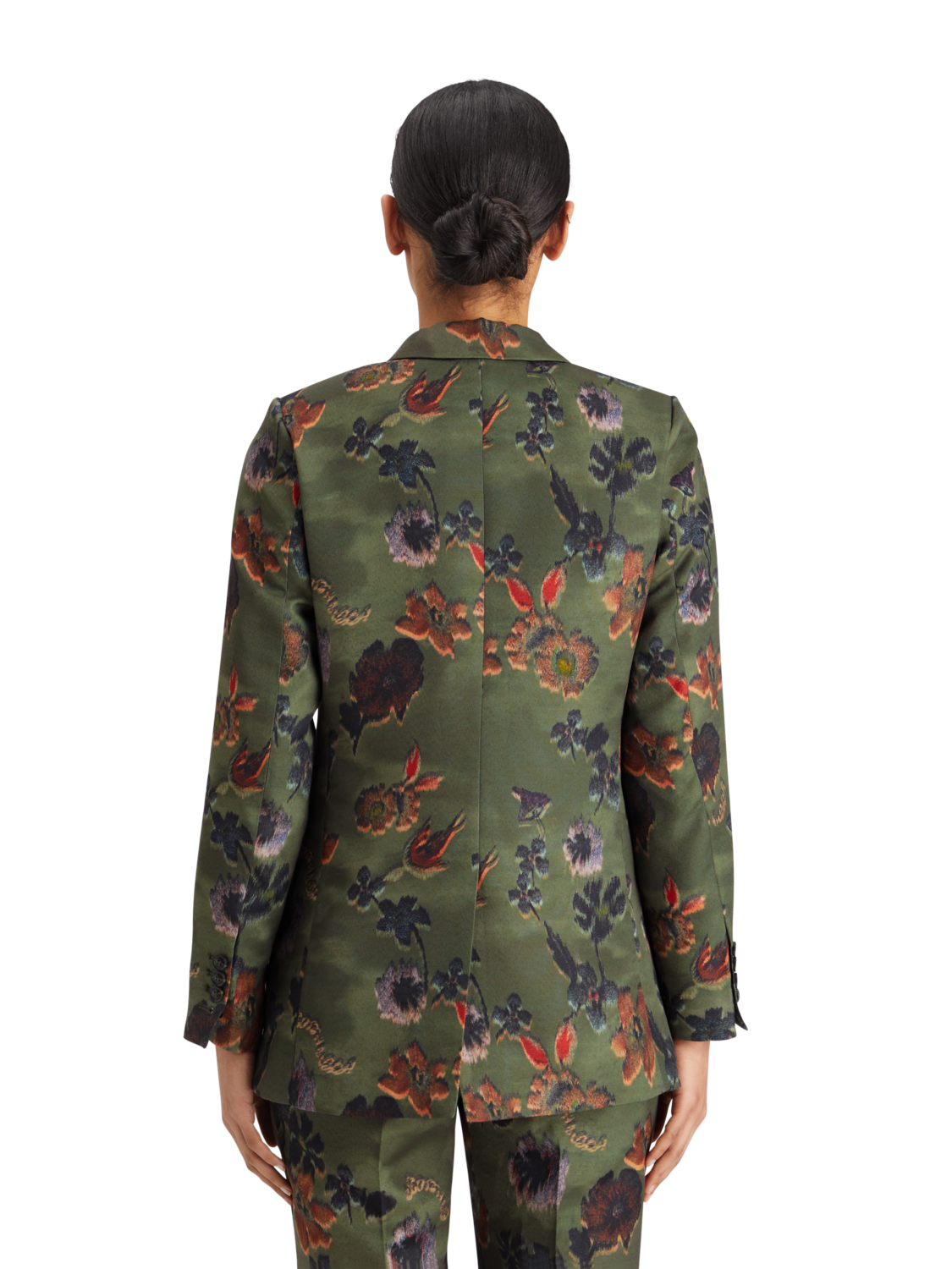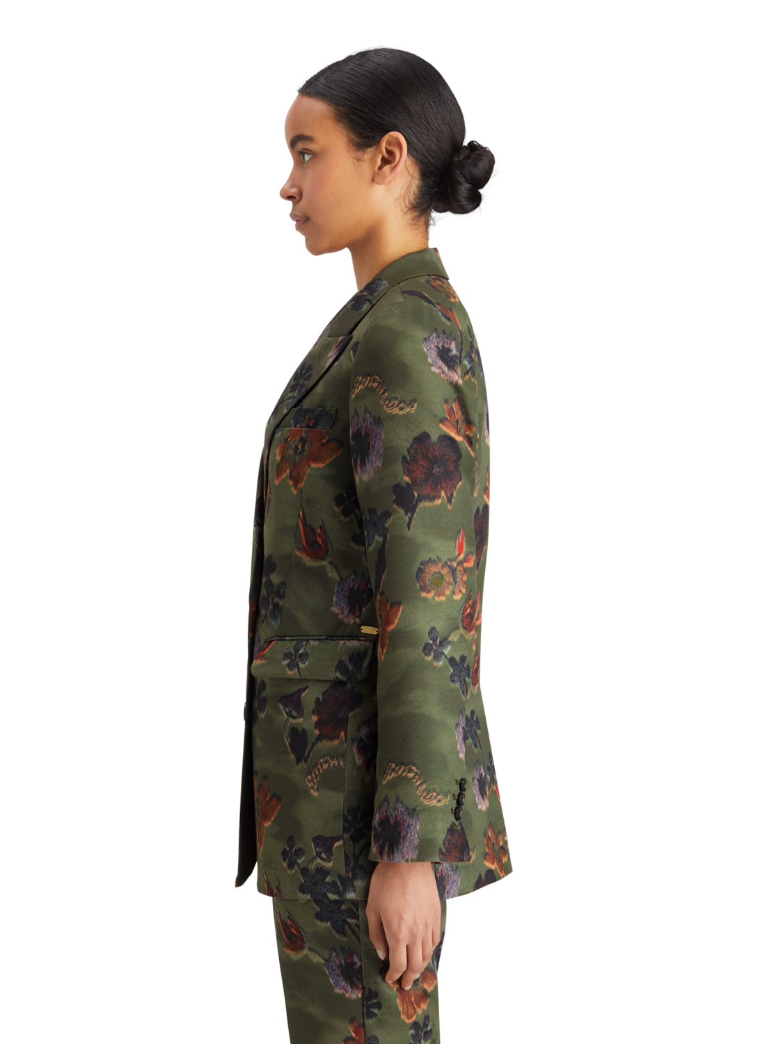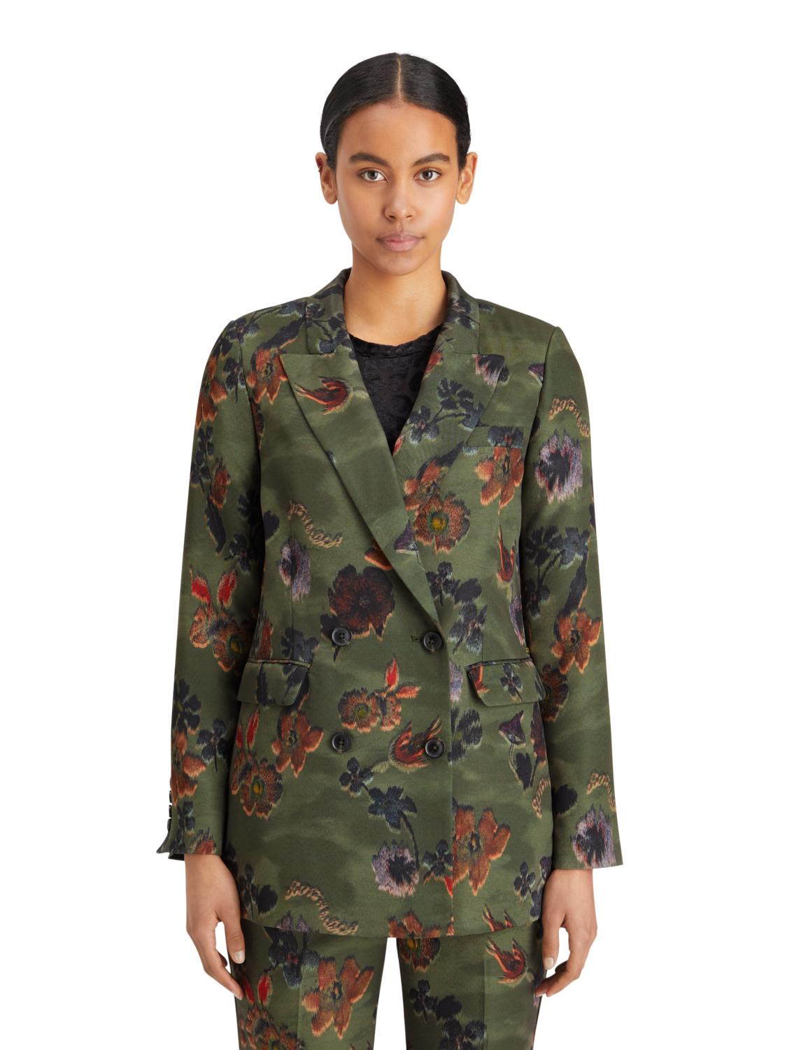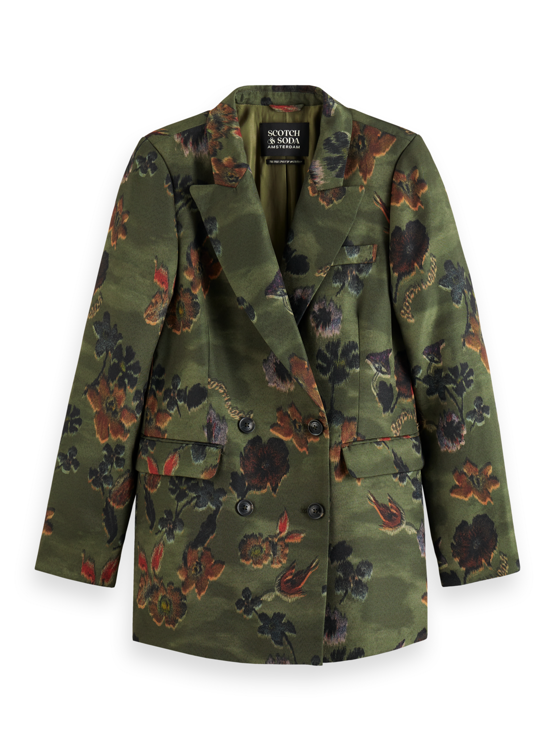 A double breasted blazer with two button closure. Featuring an all-over floral tapestry & military vibe print.