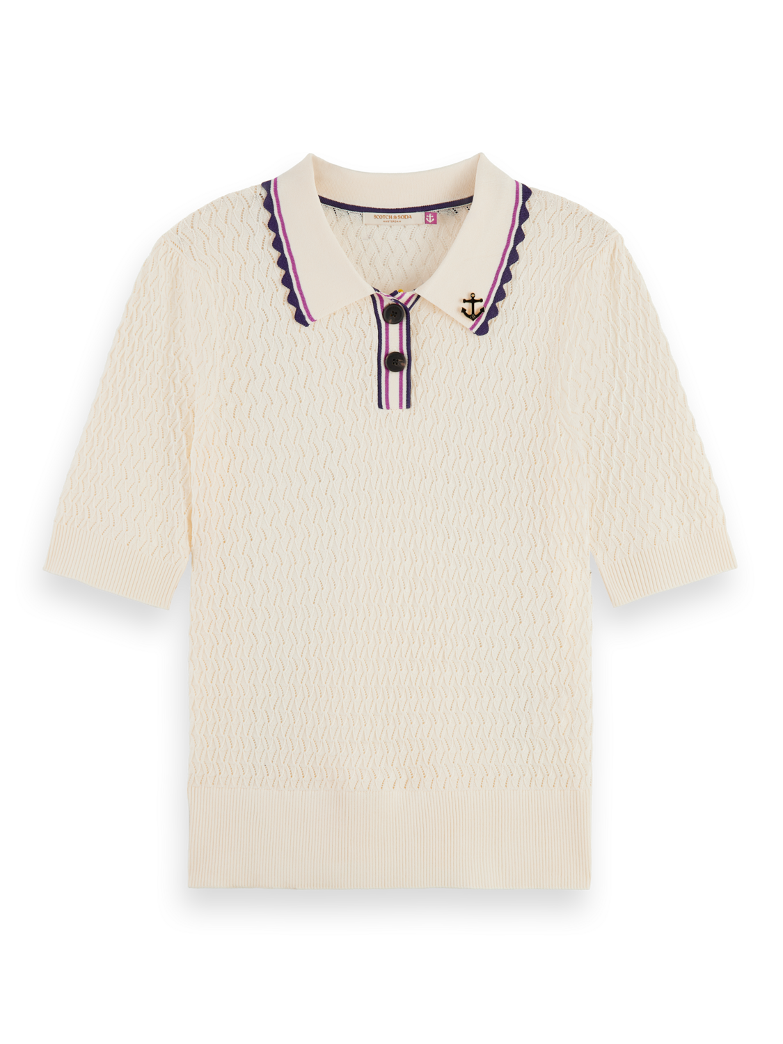 A chic knitted polo top featuring pointelle detailing & a two button placket with an anchor pin on the collar.