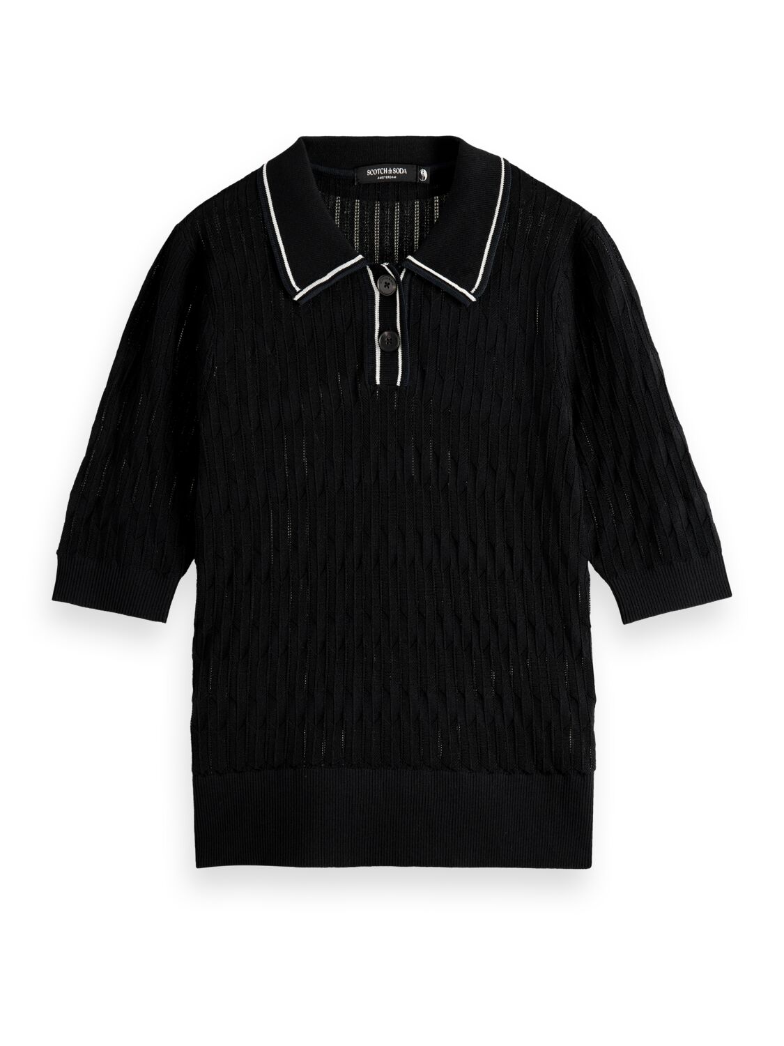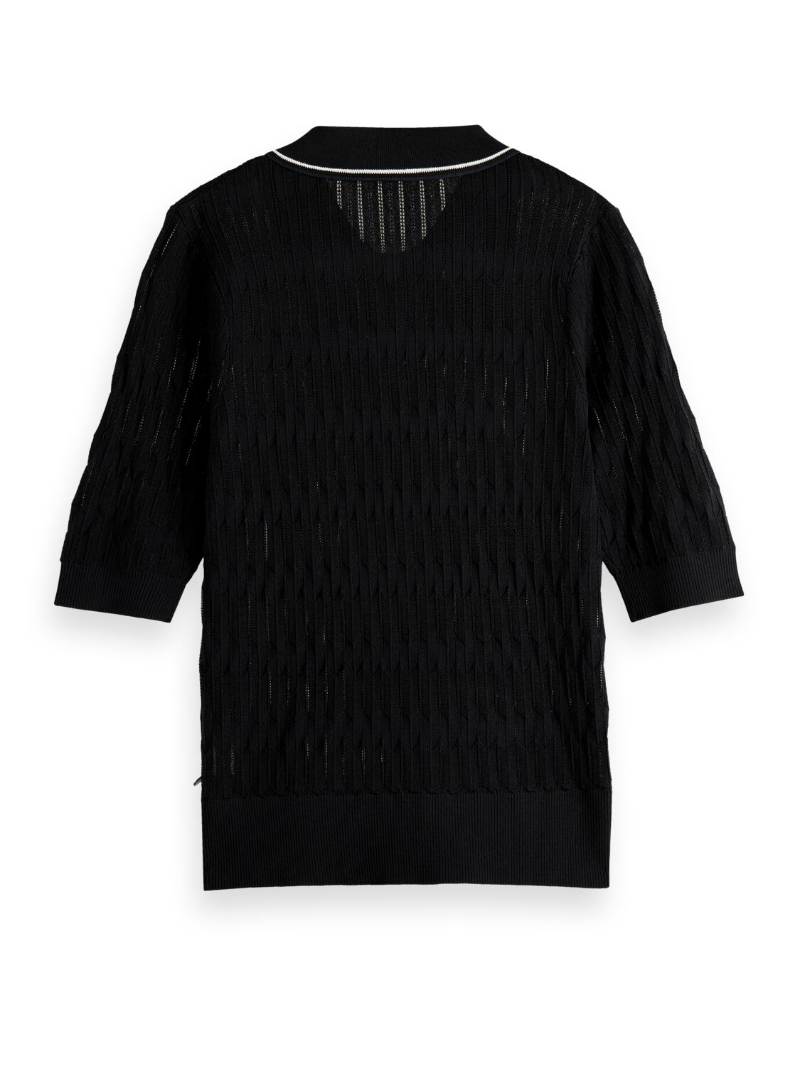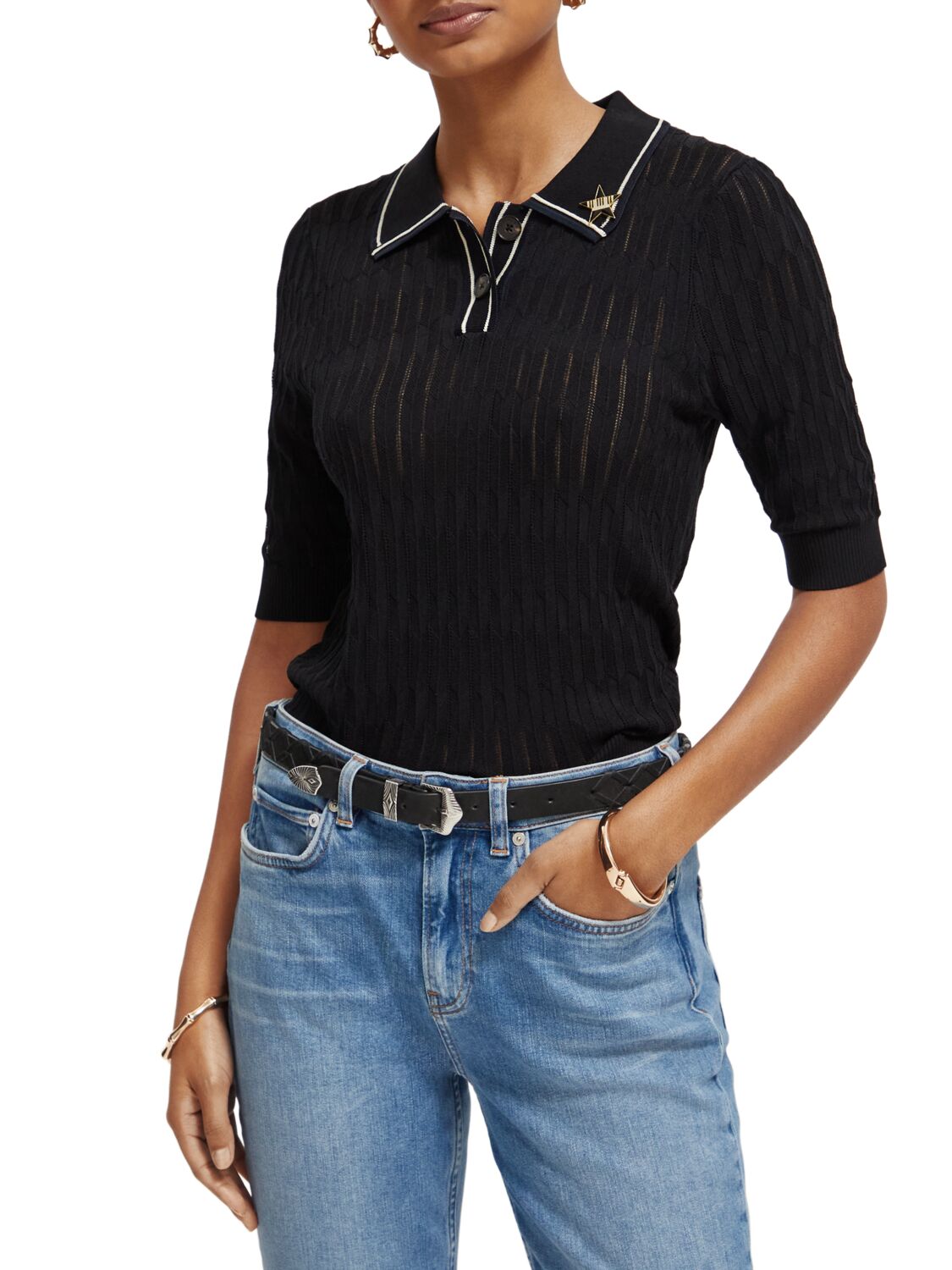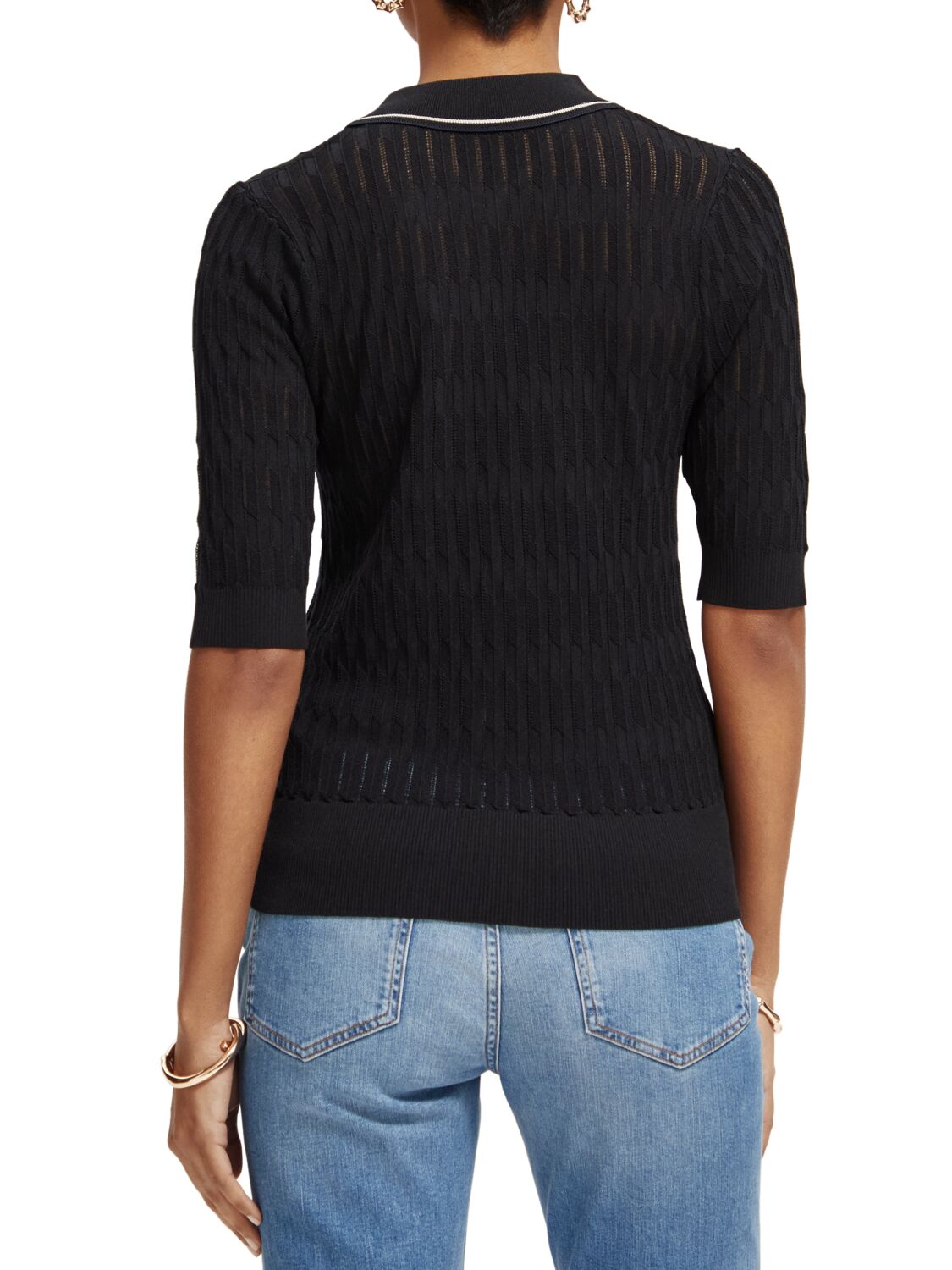 A polo style knitted top featuring pointelle detailing & classic two-button placket.