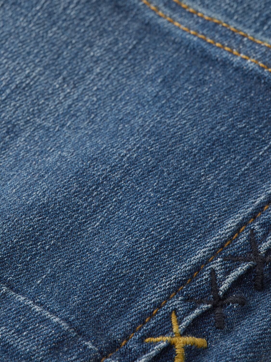 Regular slim fit jean accompanied with a button fly, finished in a dark blue wash.