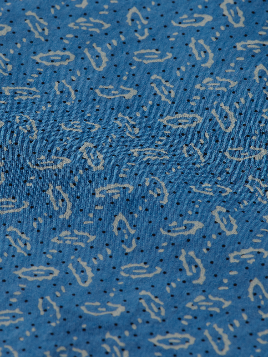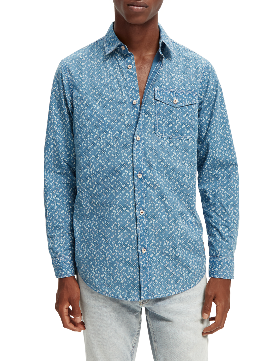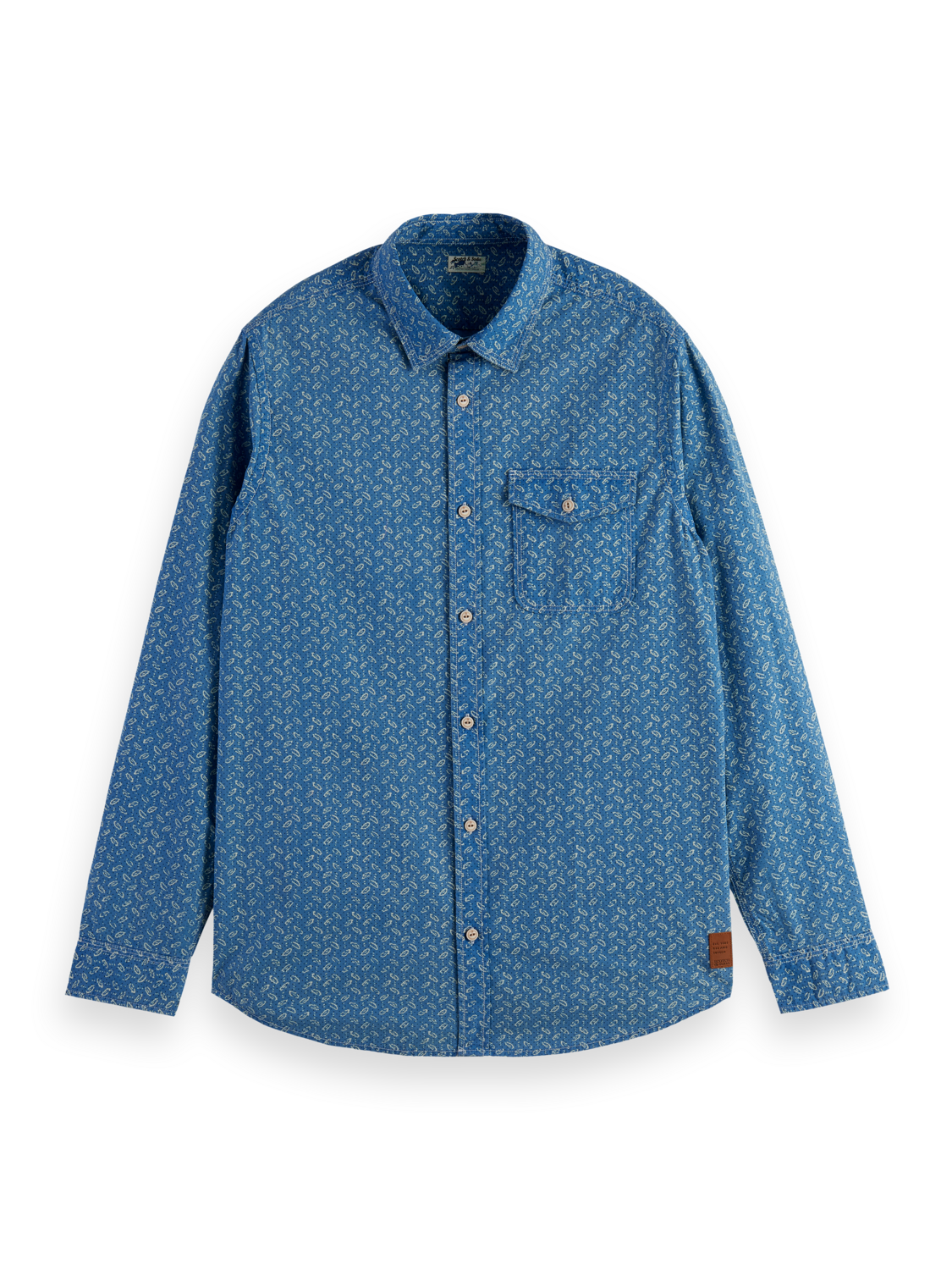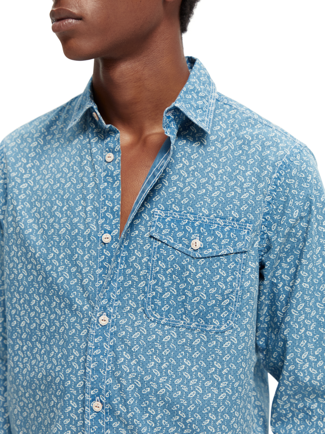 The Scotch & Soda shirt is perfect for layering or wearing on its own and comes in a blue print fabric.