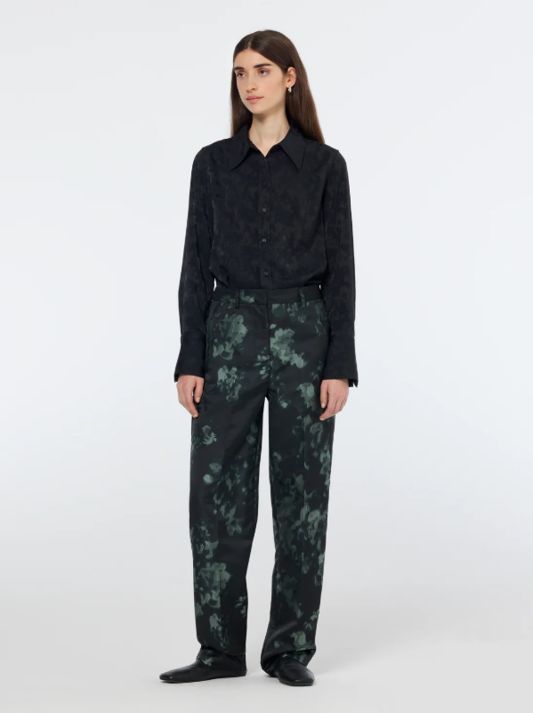 A straight-leg cut, featuring button and zip closure with an elegant all-over floral print.