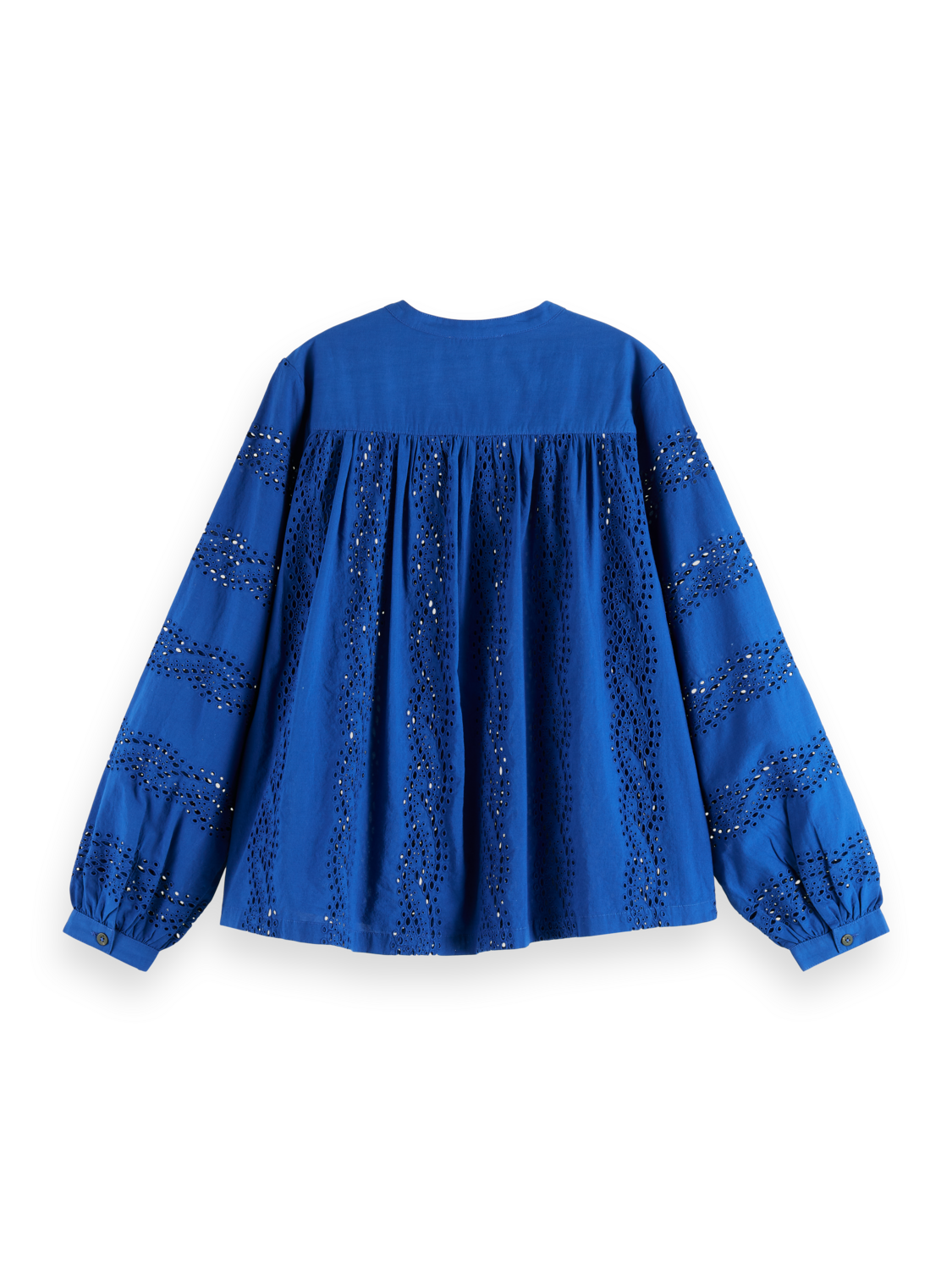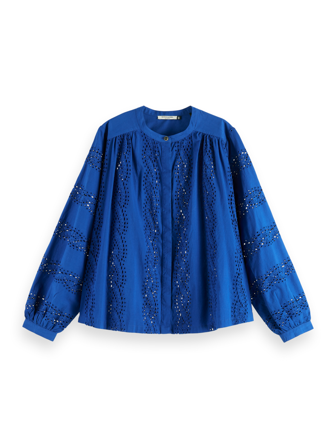 A long-sleeved blouse featuring a timeless broderie angalise design. Finished with a subtle grandad collar and button-down placket.
