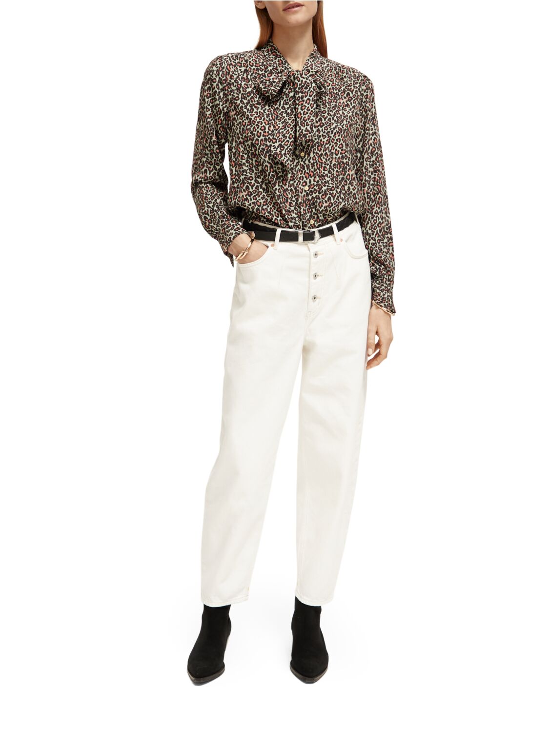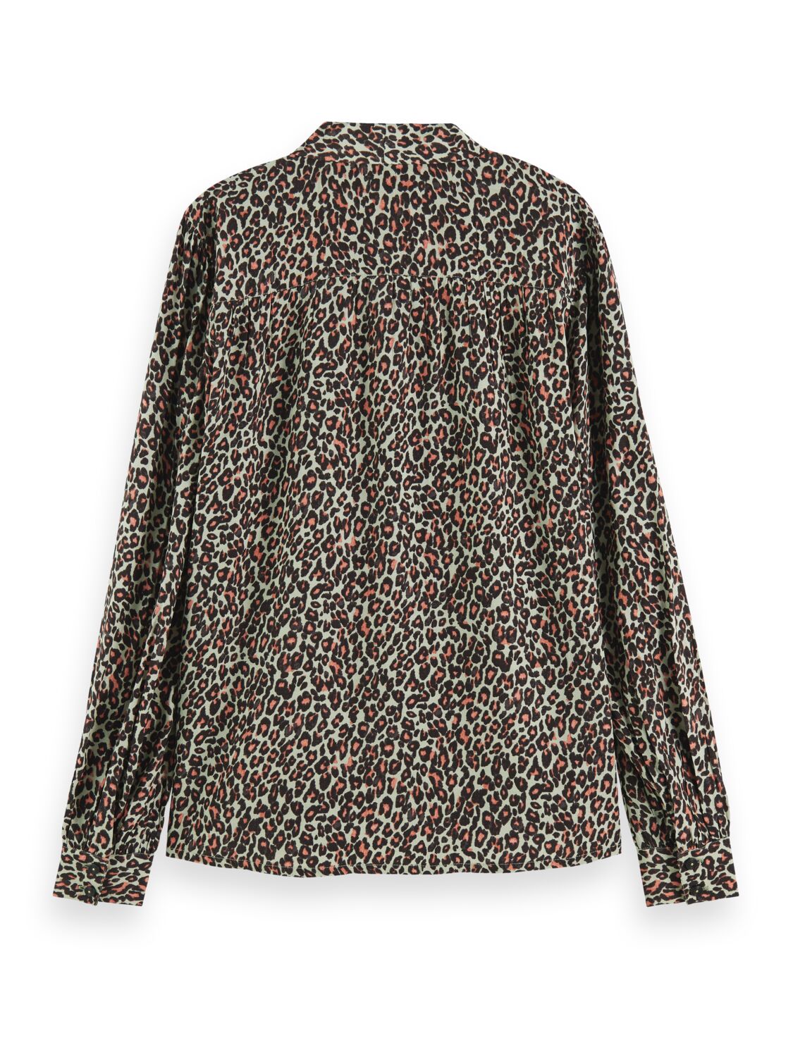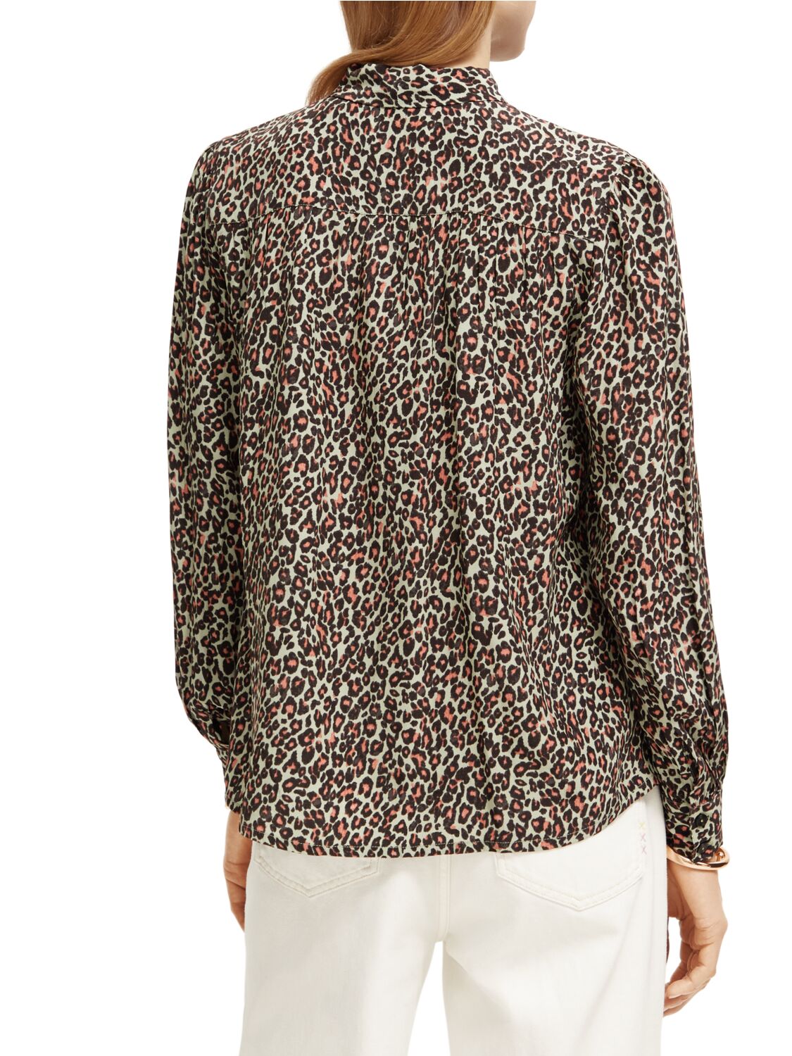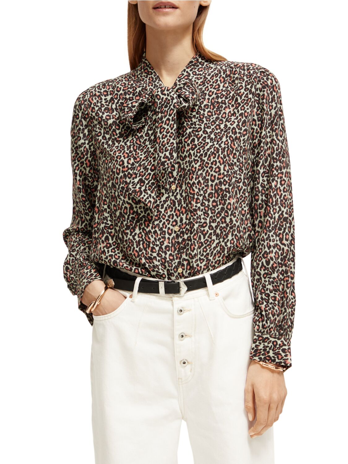 A classic long-sleeved shirt featuring an all-over leopard print & tie around the neckline.