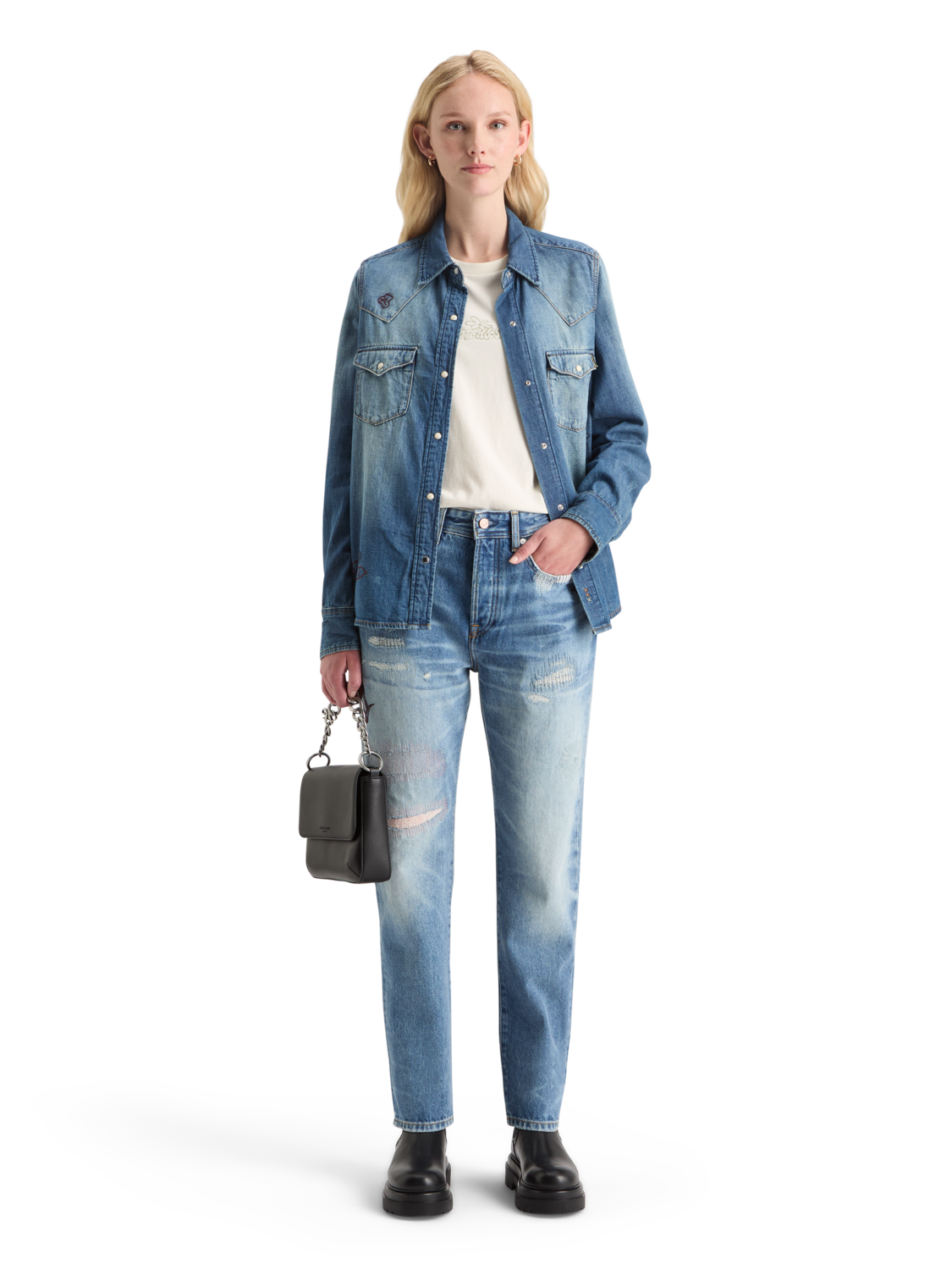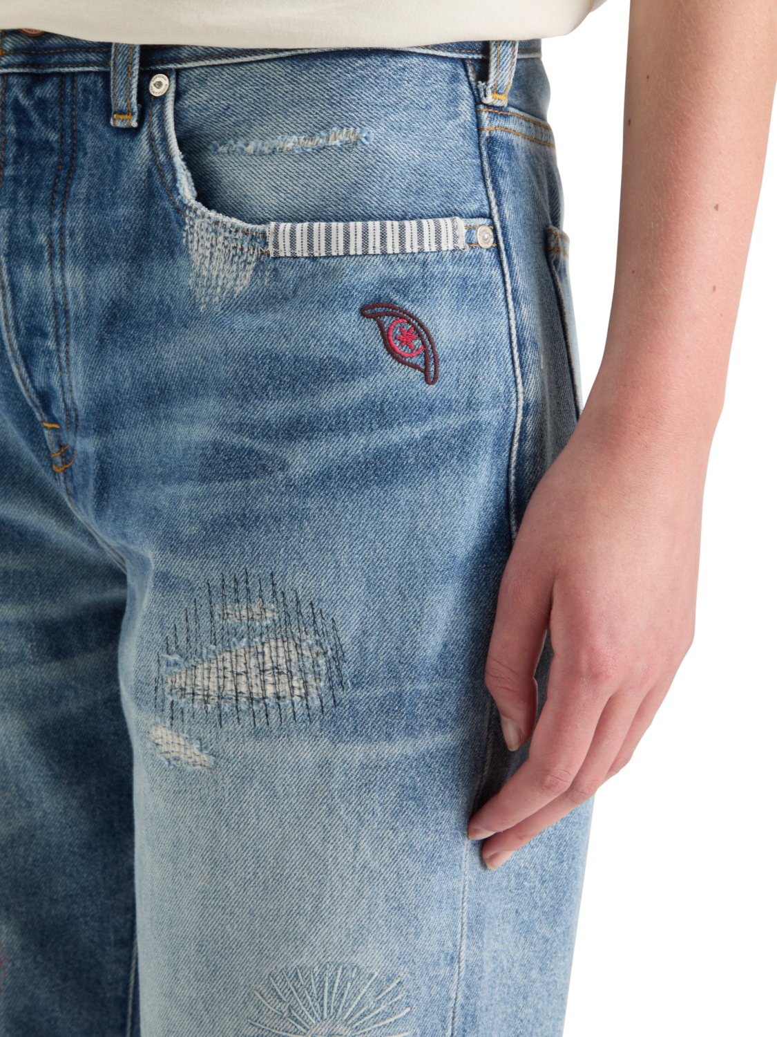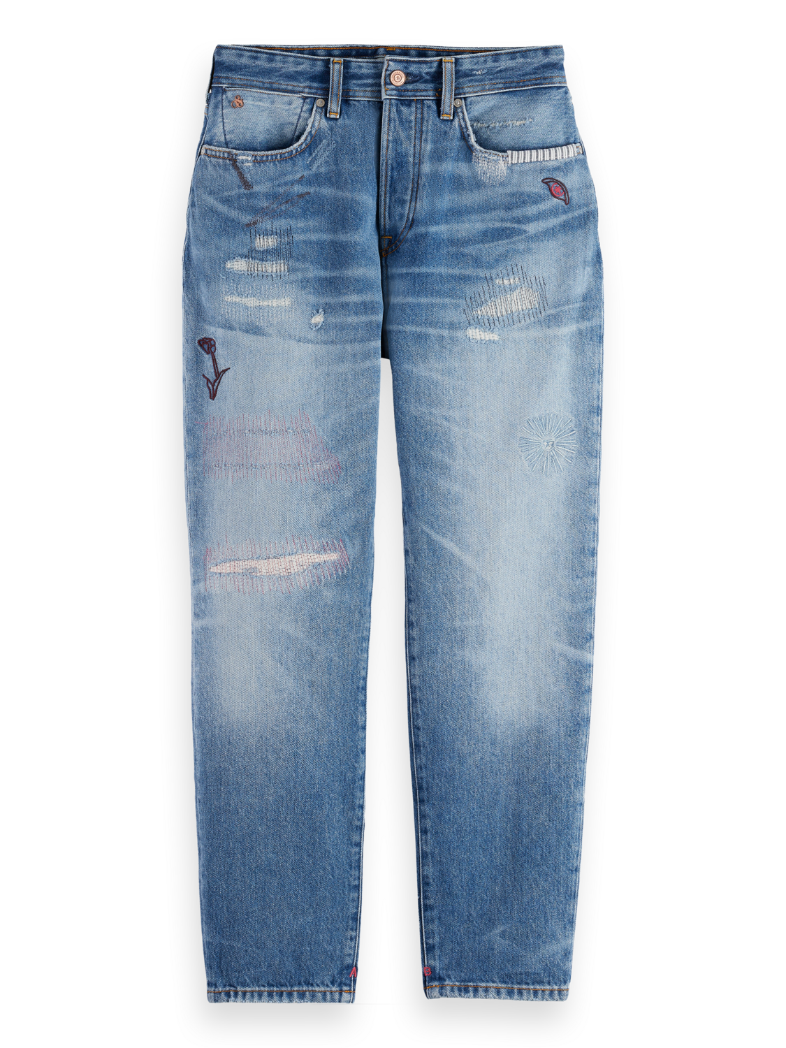 A relaxed boyfriend fit & mid rise waist, featuring 5 pocket styling & distressed look.