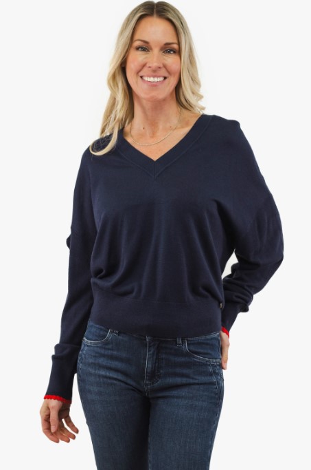 A pullover sweater boasts a flattering v-neck design. Featuring ribbed cuffs & hem.