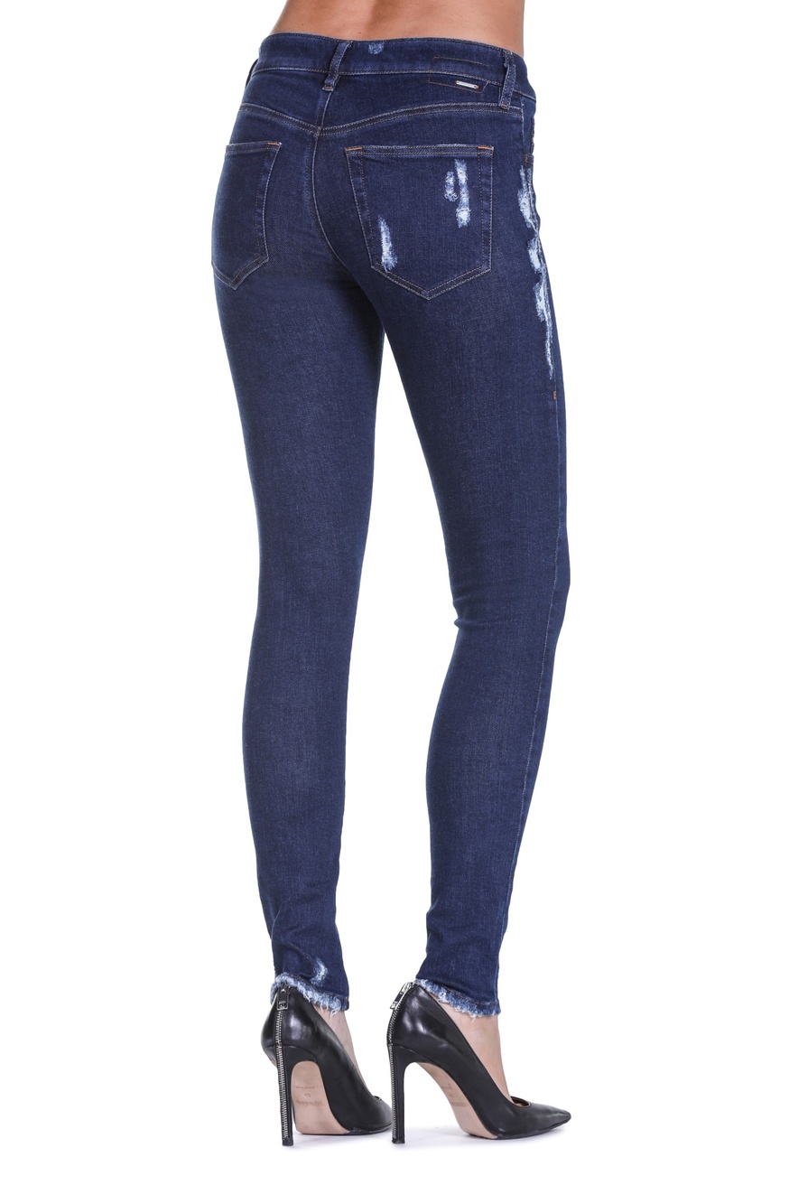 Super skinny style jean with regular waist and zip fly, super stretch finished in dark blue wash.