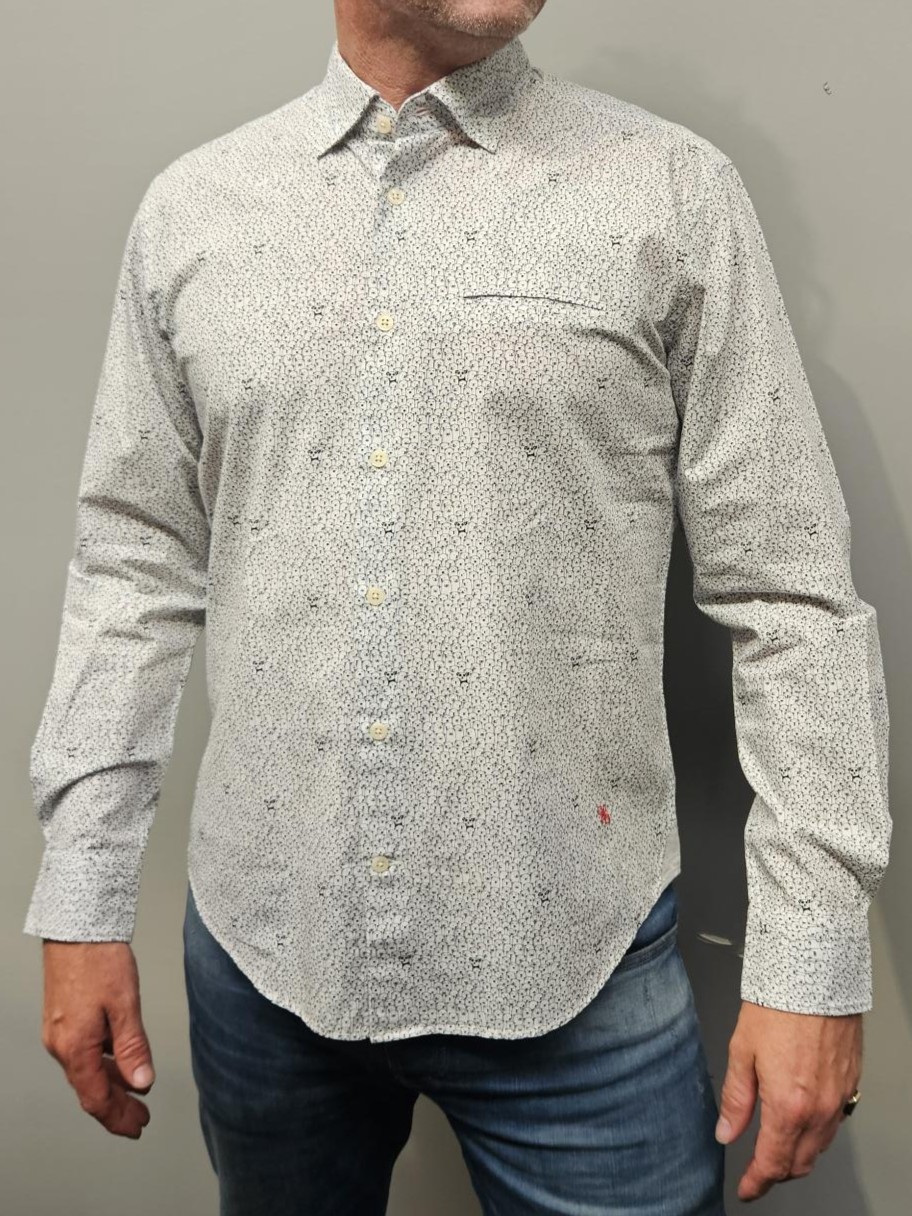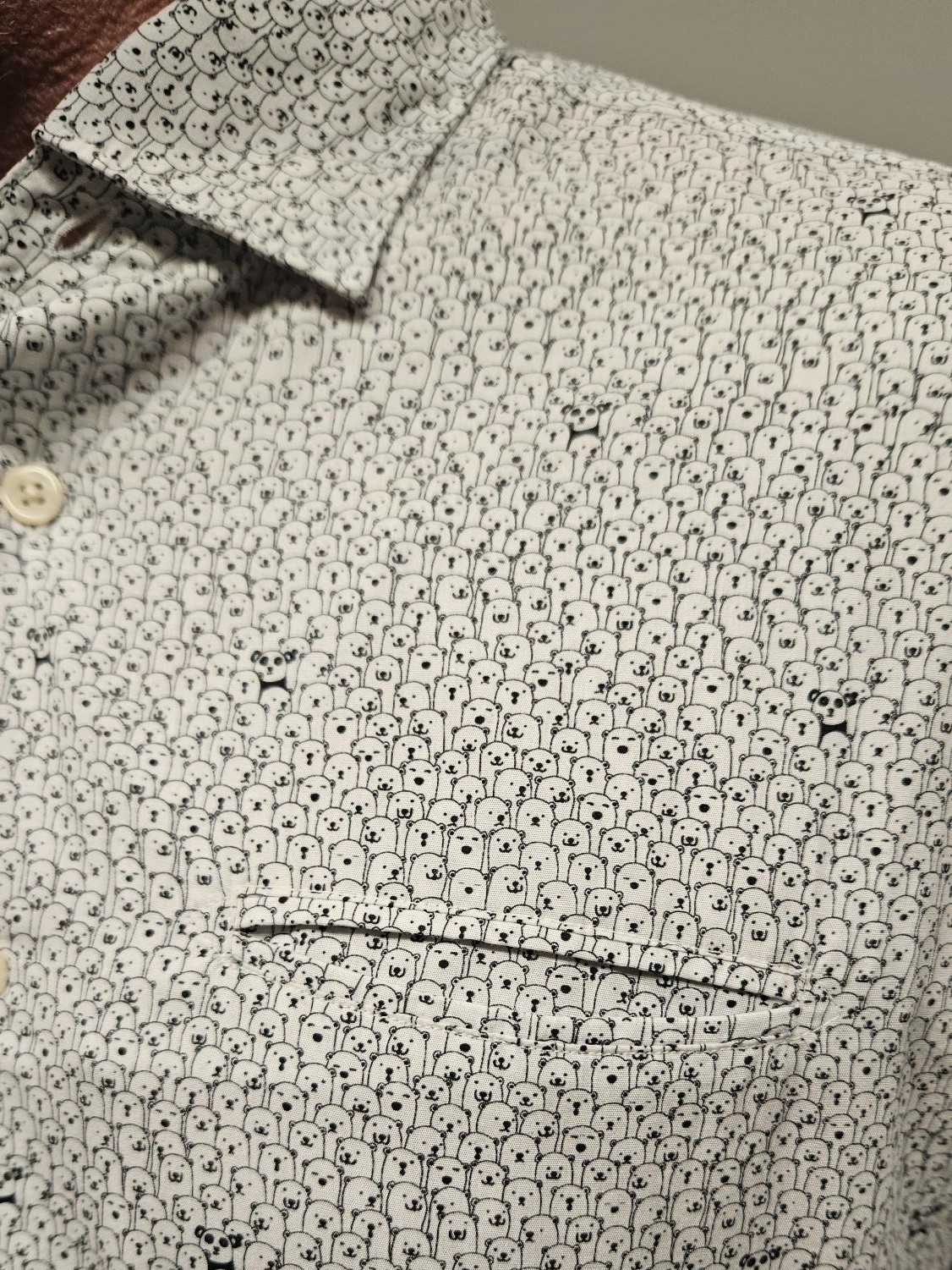 A regular fit, long sleeve cotton shirt with mini polar bear pattern featuring a red taped trim inside the collar.