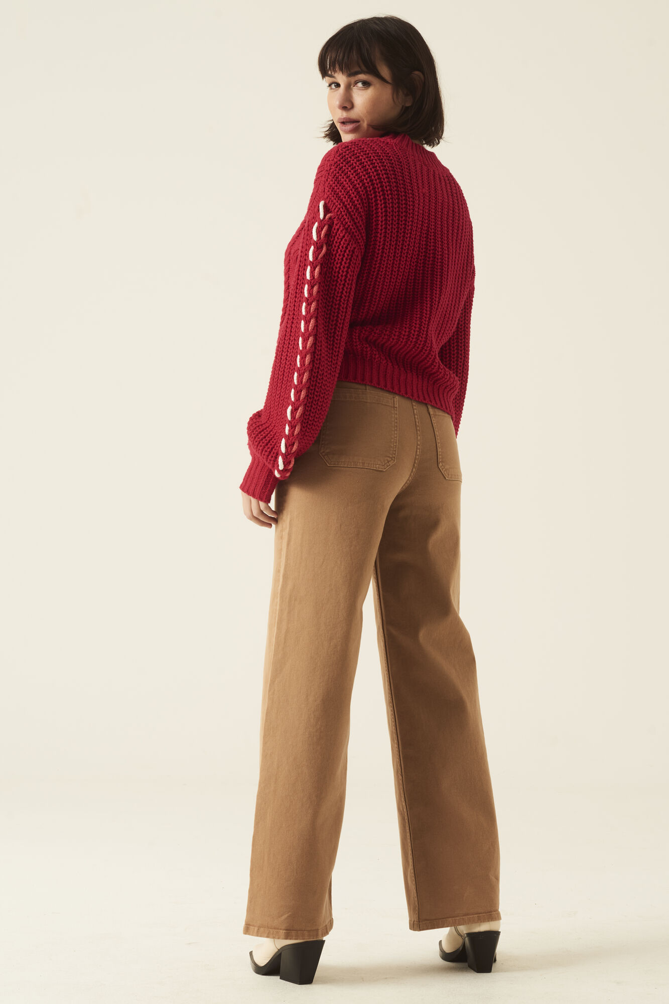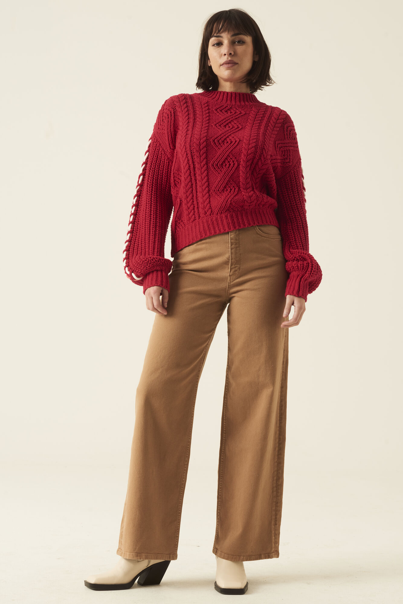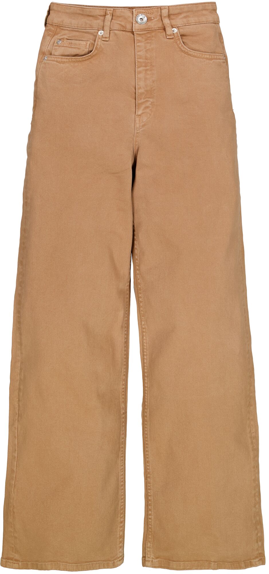 High waist, wide leg accompanied with a zip fly closure, finished in burnt sand colour.