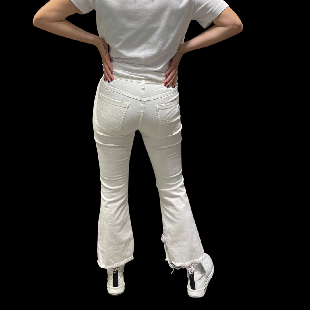 Medium waist jean with a flared leg, accompanied with a button closure, finished in iced latte.